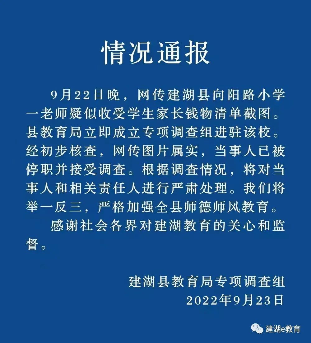 9月22日晚,网传江苏盐城建湖县向阳路小学一老师疑似收受学生家长钱物清单截图。县教育局立即成立专项调查组进驻该校。经初步核查,网传图片属实,当事人已被停职并接受调查。根据调查情况,将对当事人和相关责任人进行严肃处理。我们将举一反三,严格加强全县师德师风教育。