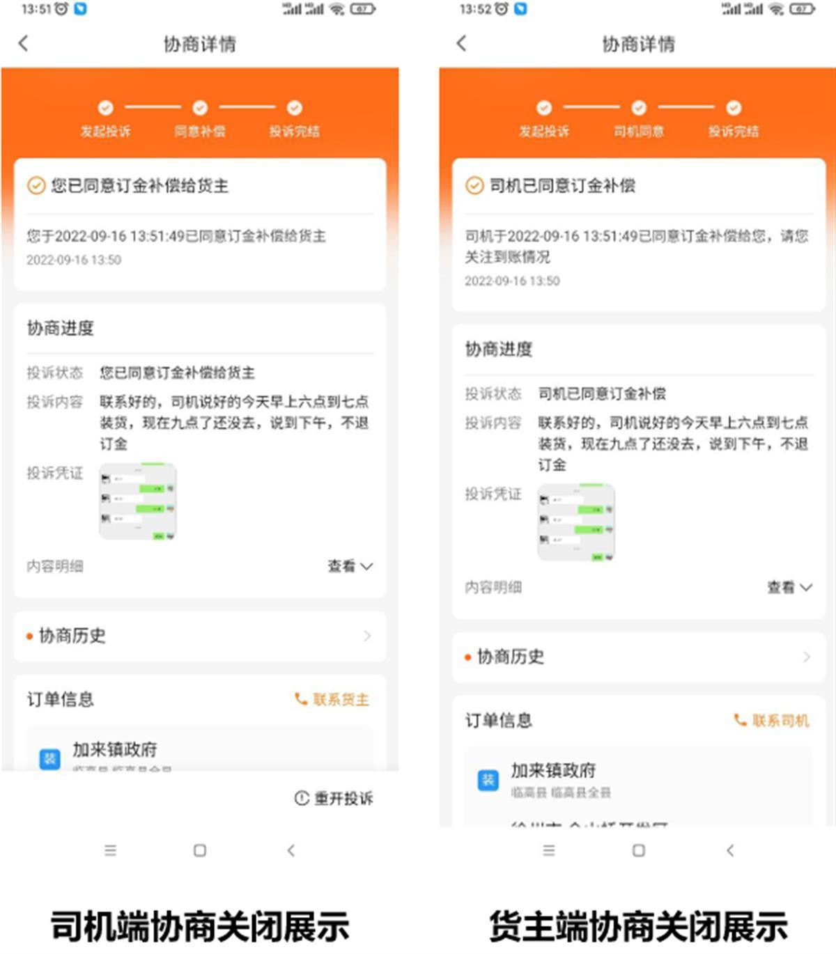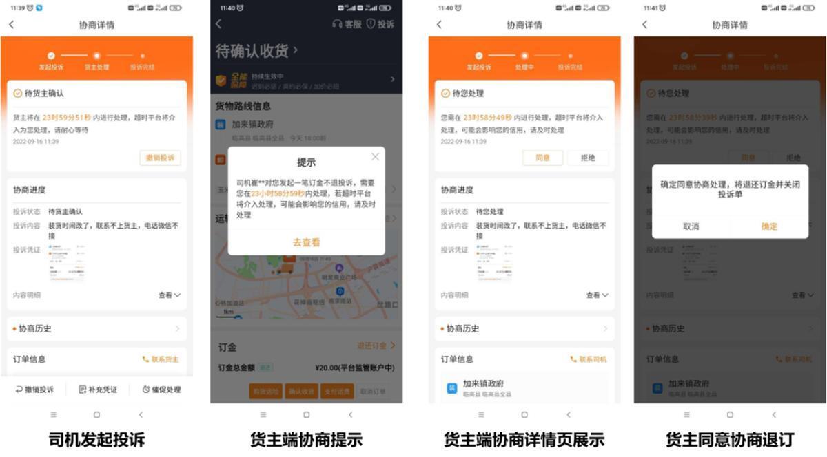 长期以来,货运市场纠纷频繁、情况复杂、处理周期长,一直是货运从业者的一块心病。“以前要找客服反复协调,处理过程比较复杂,时间也比较长,最快也要几个小时。现在只要我们在平台提交凭证,平台就会通知货主,如果货主认可,点击‘同意’确认,我们就很快能收到订金了。这个功能和淘宝退货的功能有点相似,先让我们提前举证,友好协商,协商不成平台客服再介入调解。”货车司机王师傅对这个功能非常认可。