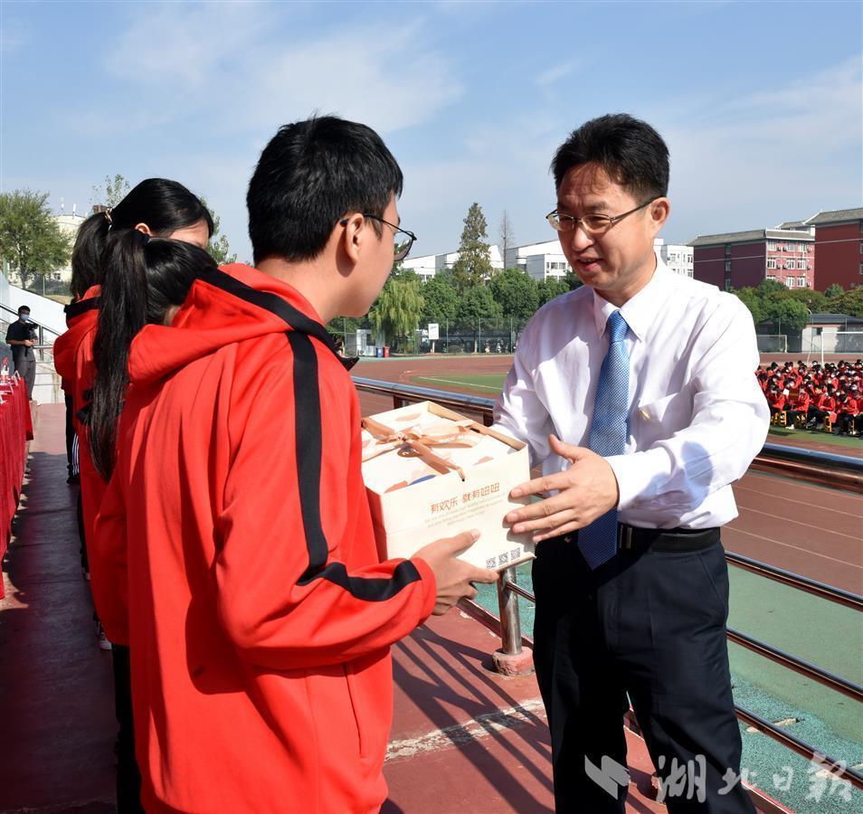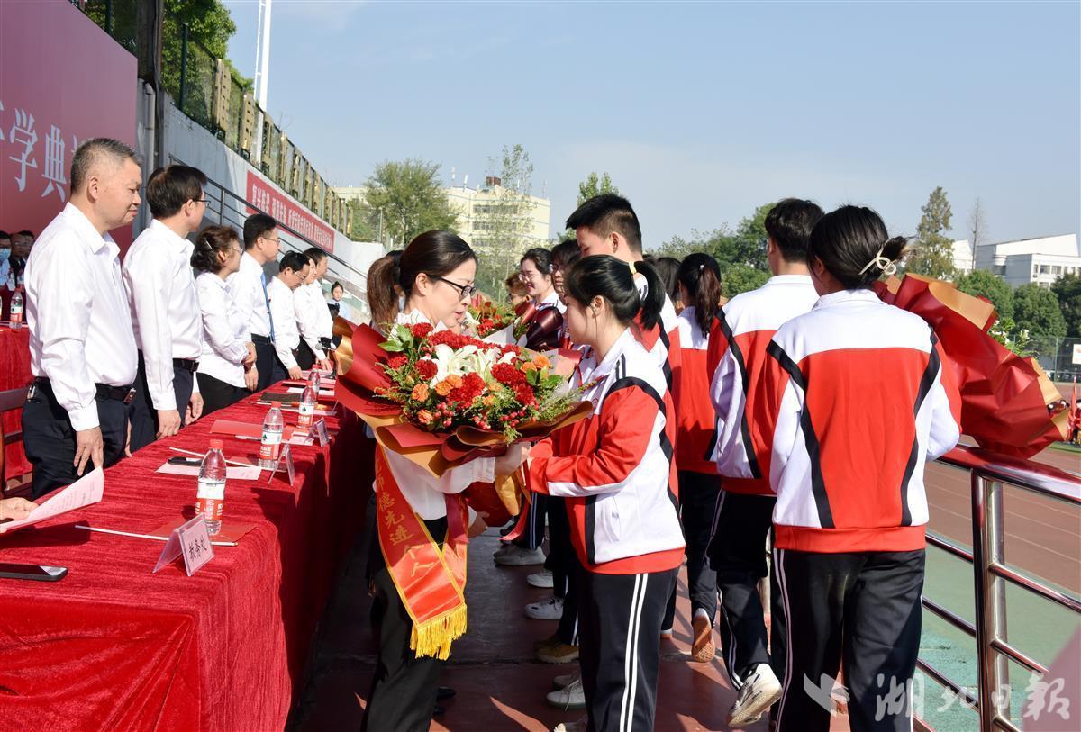 开学典礼现场,副校长刘伦钊宣读学校《中共湖北文理学院委员会关于表彰师德标兵和师德先进个人的决定》;学生代表向受表彰的老师献花,向老师们表达崇高的敬意与衷心的感谢。