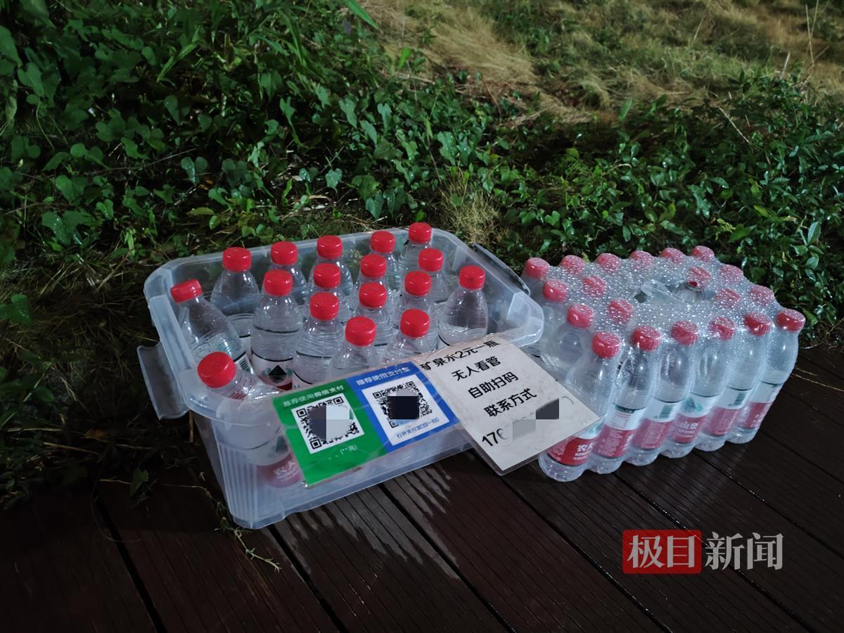 在常先生的指引下,9月26日,极目新闻记者找到这条沿湖小道,1公里多的距离,设置有5个无人看守矿泉水箱。有的装满了矿泉水,有的已经被拿了一半,透明的箱子上贴了支付宝和微信收款码,还有一张被塑封覆盖过的A4纸,上面打印着:“矿泉水2元一瓶,无人看管,自助扫码,联系方式……”