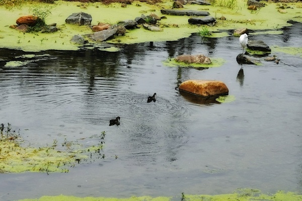 白鹭和野鸭在河道觅食 通讯员供图