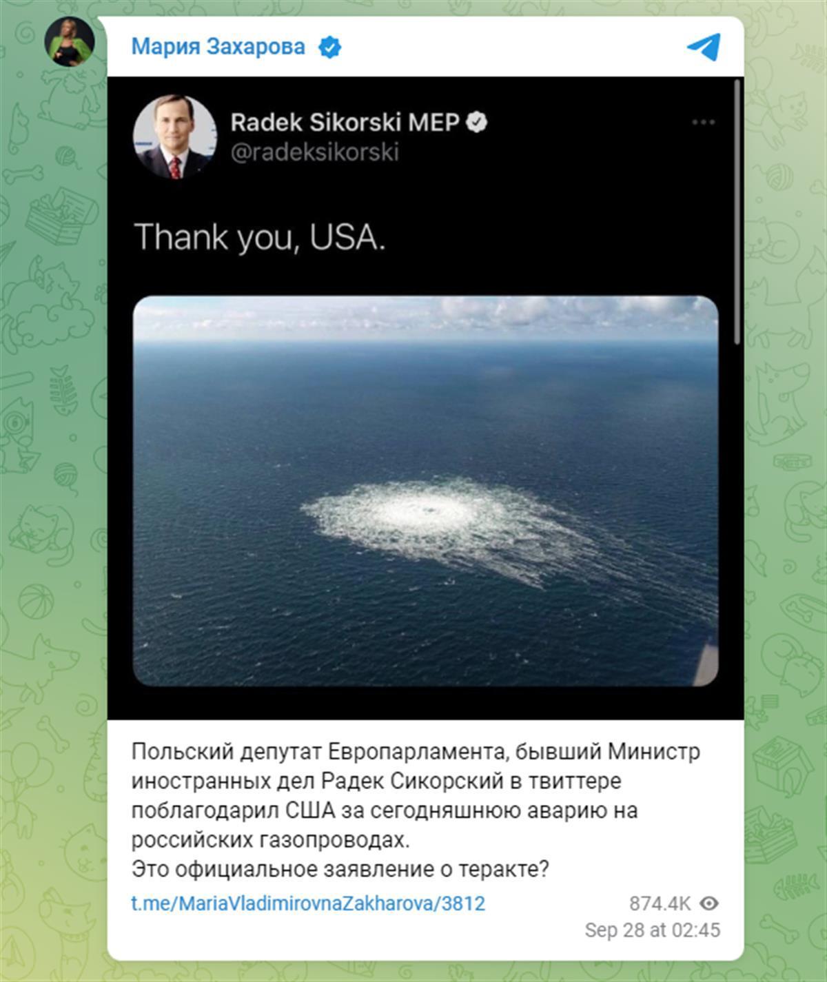 据俄新社9月27日报道,西科尔斯基在社交媒体上发文后,俄罗斯外交部发言人扎哈罗娃立即转发并质问:“关于今天发生的俄罗斯天然气管道事故,波兰环境保护部、前外交部长西科尔斯基在社交媒体上感谢美国。这是关于恐怖袭击的官方声明吗?”