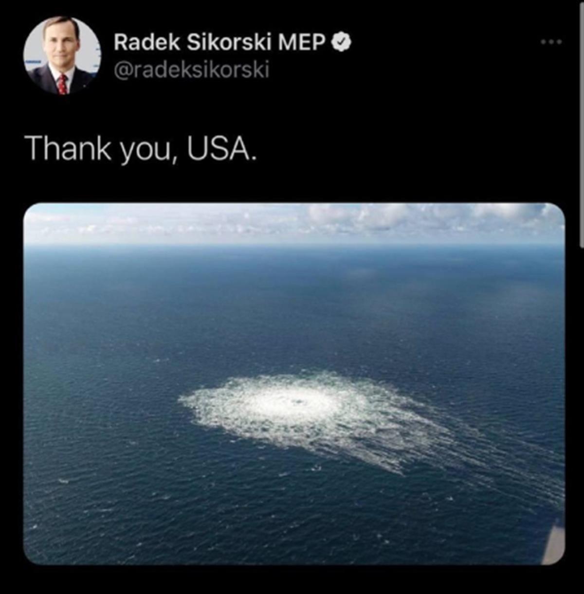 就在众人对幕后黑手众说纷纭时,波兰前外交部长拉多斯瓦夫·西科尔斯基在社交媒体上发文:“谢谢你,美国。”文字下方还配有“北溪-2”管道爆炸的图片。