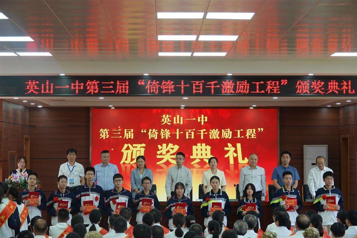 9月26日,湖北英山一中第三届“倚锋十百千激励工程”颁奖典礼隆重举行,李雨丰、刘英等30名老师荣获“红烛奖”,每人喜获奖金5000元;程睿、王瓖婷等100名学生荣获“英才奖”,每人获奖金1000元,两项奖金合计25万元。