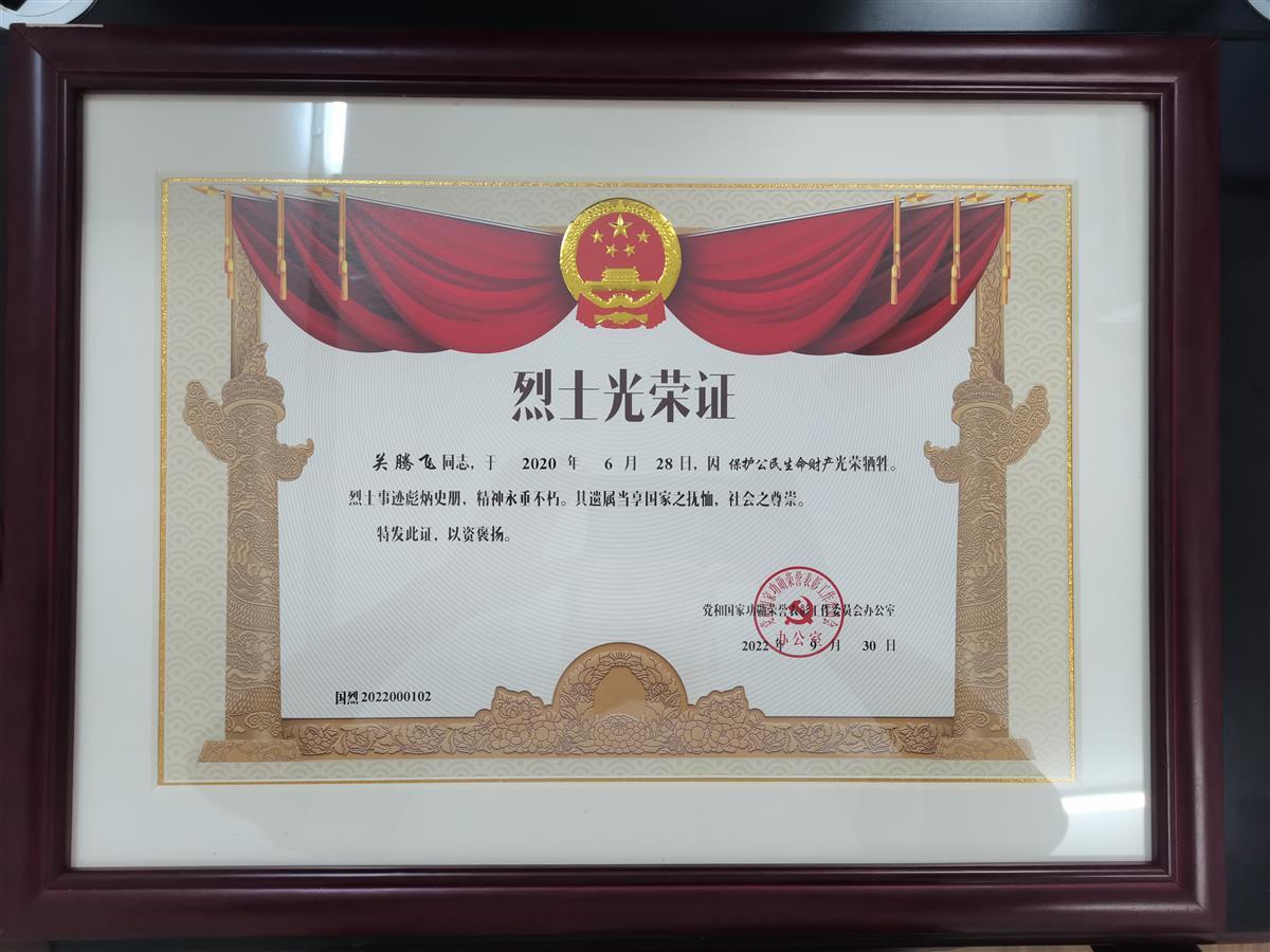逝者往已,英名长存。2021年10月,关腾飞被广东省人民政府评定为烈士;2022年6月,关腾飞当选为第八届湖北省见义勇为道德模范;2022年9月,党和国家功勋荣誉表彰工作委员会正式为其下发《烈士光荣证》。