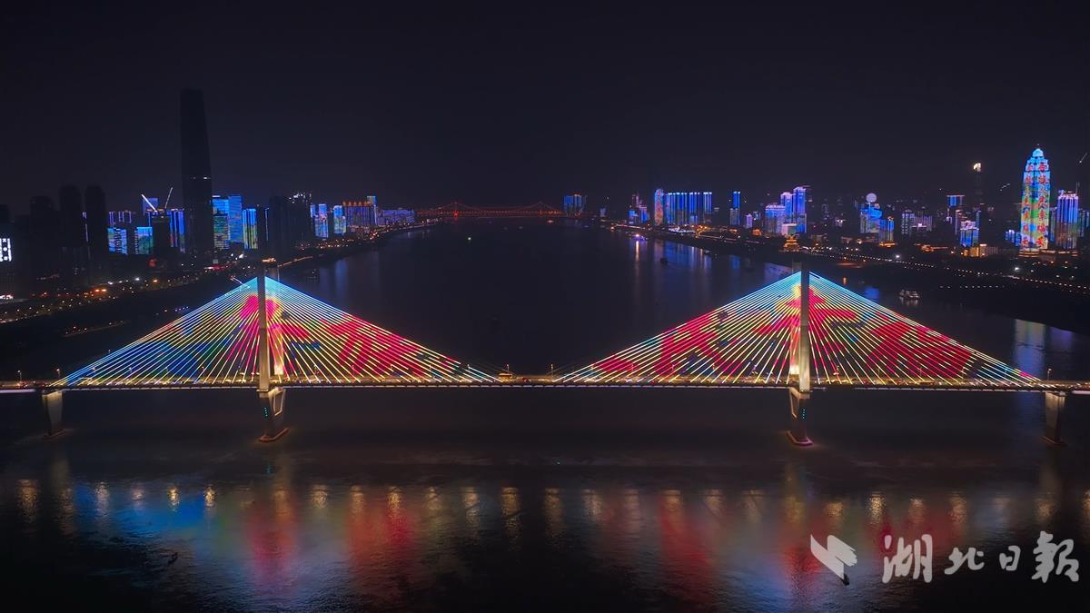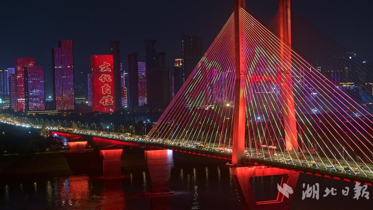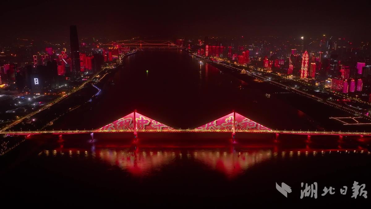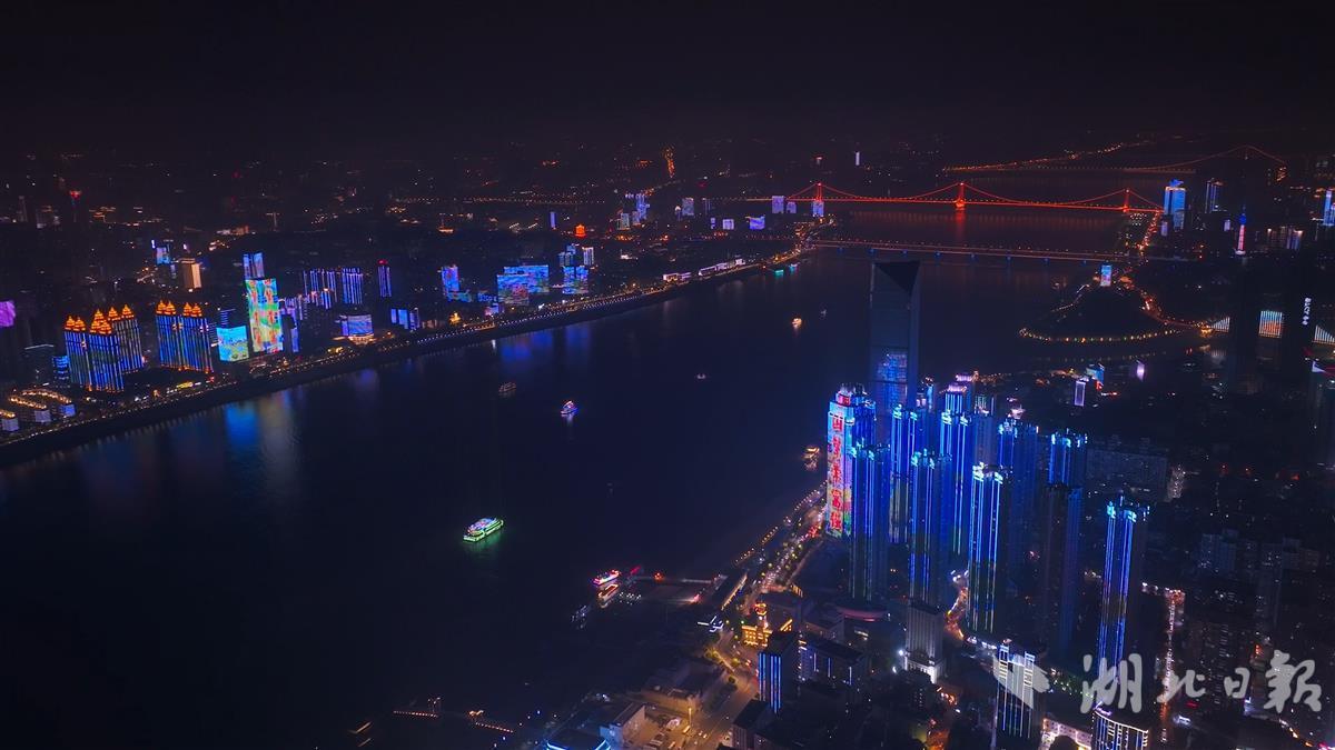 当晚,以喜庆红为主基调的灯光秀点亮长江之滨。伴随着光影变幻,长江灯光秀依托武汉“山、水、江、桥”的特色,联动长江大桥至长江二桥之间两岸楼宇、桥梁、黄鹤楼、龟山电视塔及长江游船等亮化景观,生动展现中国新时代的变革性实践、突破性进展、标志性成果,充分反映中国人民踔厉奋发、笃行不怠的精神风貌,如画美景绵延长江主轴25公里。