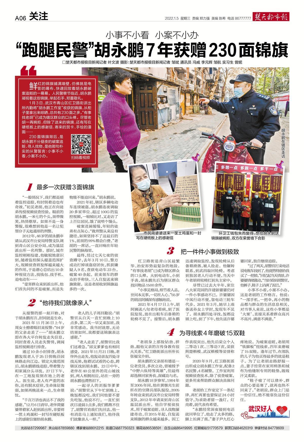 今年1月,楚天都市报极目新闻推出《“跑腿民警”胡永鹏7年获赠230面锦旗》新闻报道,引发社会广泛关注。中央政法委、共青团中央、公安部、新华社等官方微博纷纷转载,全媒体点击量超过千万。4月,胡永鹏等9位个人和1个集体光荣当选2021“荆楚楷模”年度人物。5月25日,公安部集中表彰,胡永鹏荣获“全国优秀人民警察”荣誉称号。9月,第四届湖北省“人民满意的公务员”和“人民满意的公务员集体”表彰大会在武汉举行,省委、省政府决定,给予胡永鹏等50名同志和武汉市洪山区卫生健康局等20个公务员集体记一等功。