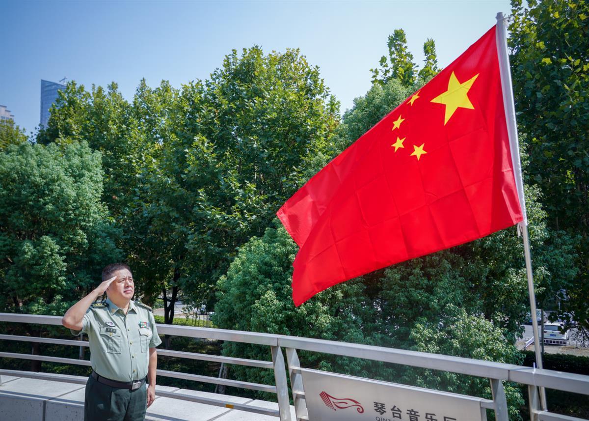 10月1日一早,61岁的马国旗来到武汉琴台大剧院广场,此时鲜艳的五星红旗在剧院两旁迎风招展,马国旗面向国旗肃立,庄严举起右手,向国旗致以崇高敬礼。