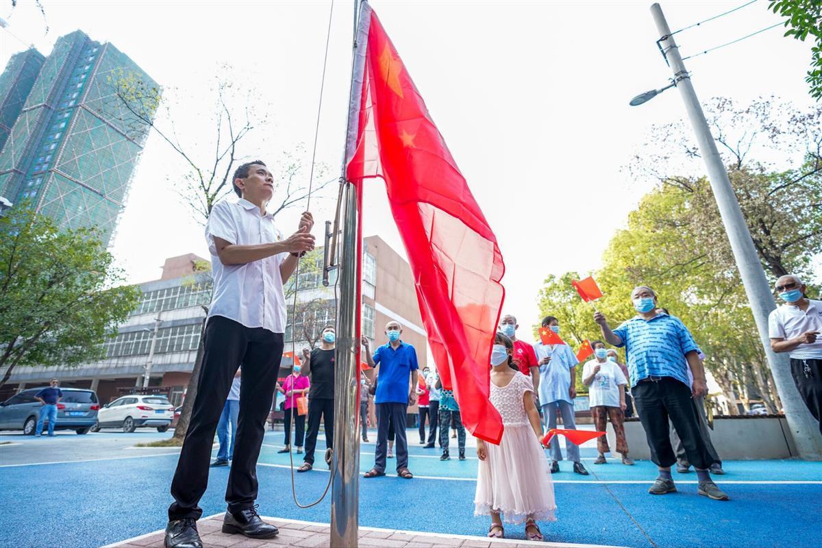 10月1日上午8时30分,在武汉市青山区武东街航舵社区广场,伴随着雄壮的《义勇军进行曲》,一面鲜艳的五星红旗冉冉升起。国旗下,十几位航舵社区居民驻足凝视,挥舞着手中的小国旗。每天看小区里升起国旗,对航舵社区居民来说并不陌生,2012年,小区广场修建了旗杆,社区居民胡体长主动提出成为护旗手,保证小区的旗杆每天升起国旗。