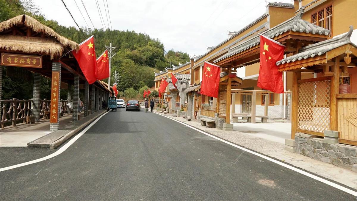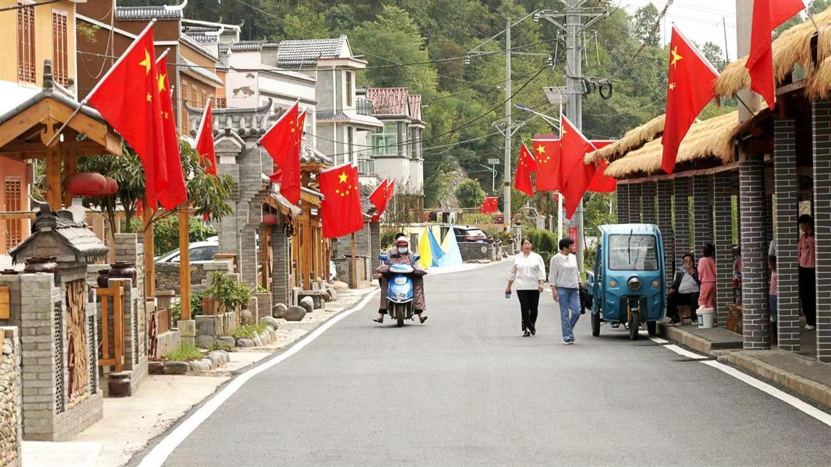 国庆节来临,湖北竹山县宝丰镇龙井村在村主要路口、村民房前悬挂国旗,全村处处洋溢着浓浓的节日氛围,喜迎国庆佳节。