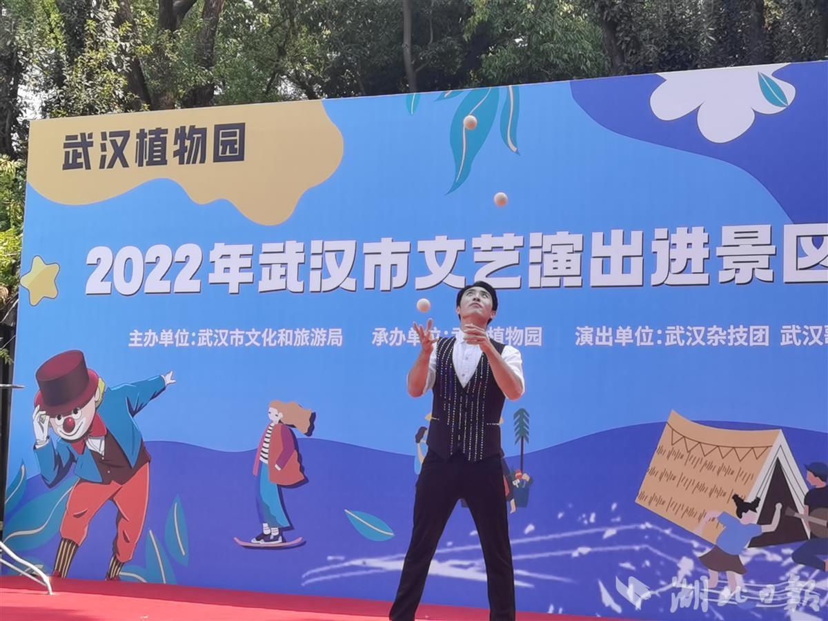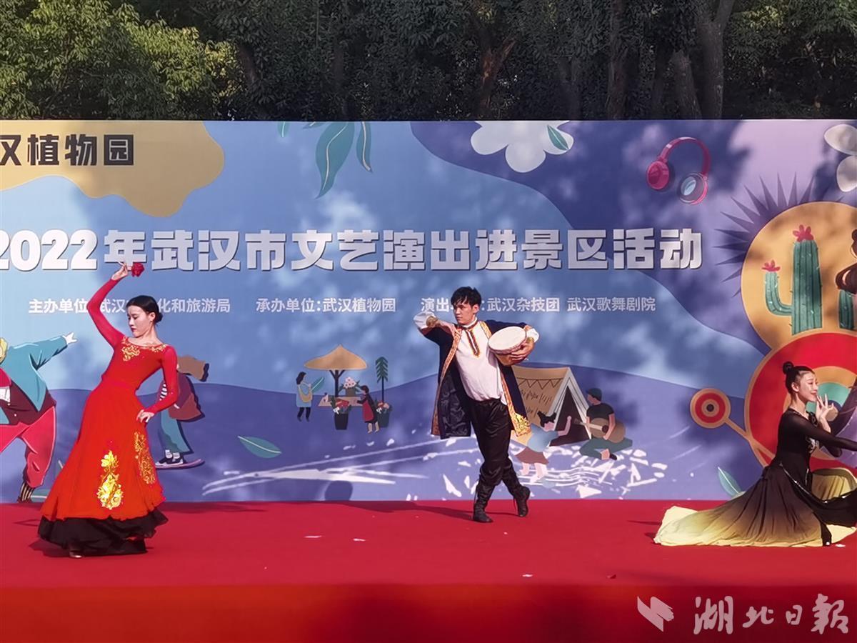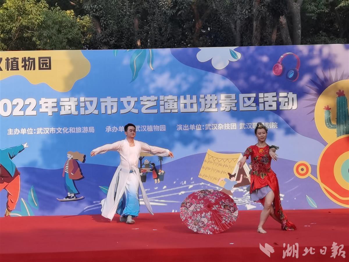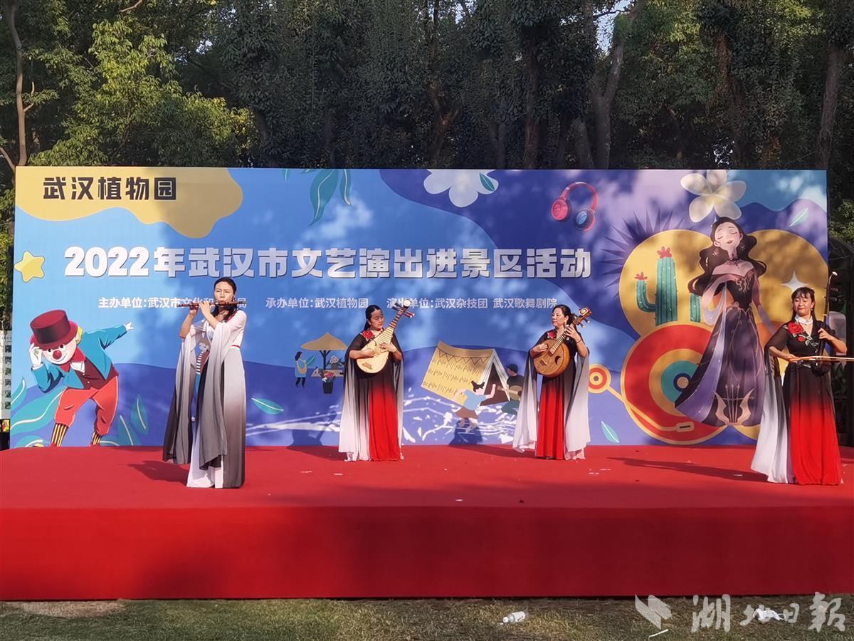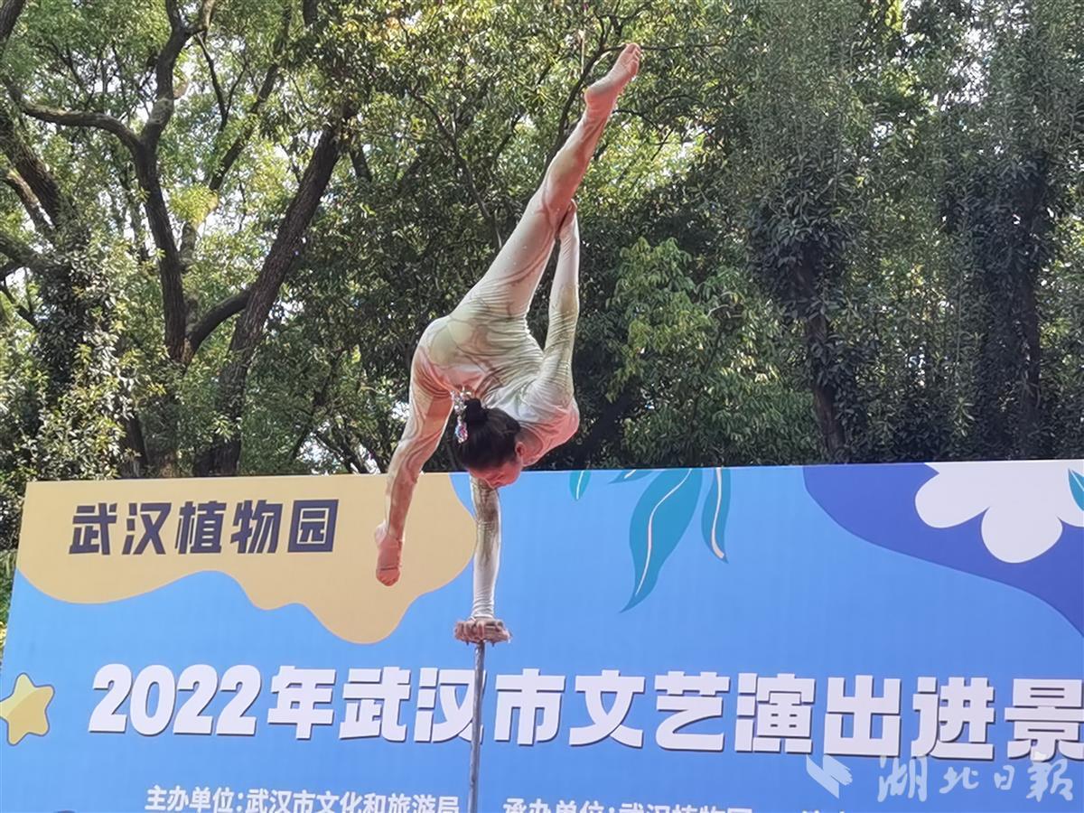 10月1日,中科院武汉植物园处处国旗招展,热闹非凡,在一处临时搭建的舞台上,来自武汉杂技团、武汉歌舞剧院的演员们各显神通,一天就表演了4场,杂技、歌舞、器乐等节目老少皆宜,异彩纷呈,许多旅客看得如痴如醉,掌声不断,不少游客还专门驱车前去看夜场。此次演出活动是2022年武汉市文艺演出进景区系列活动的一部分,由武汉市文旅局主办、武汉植物园承办。