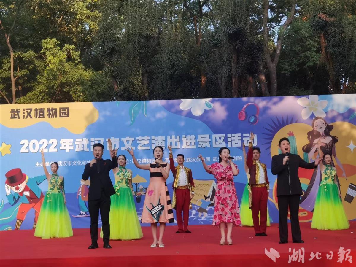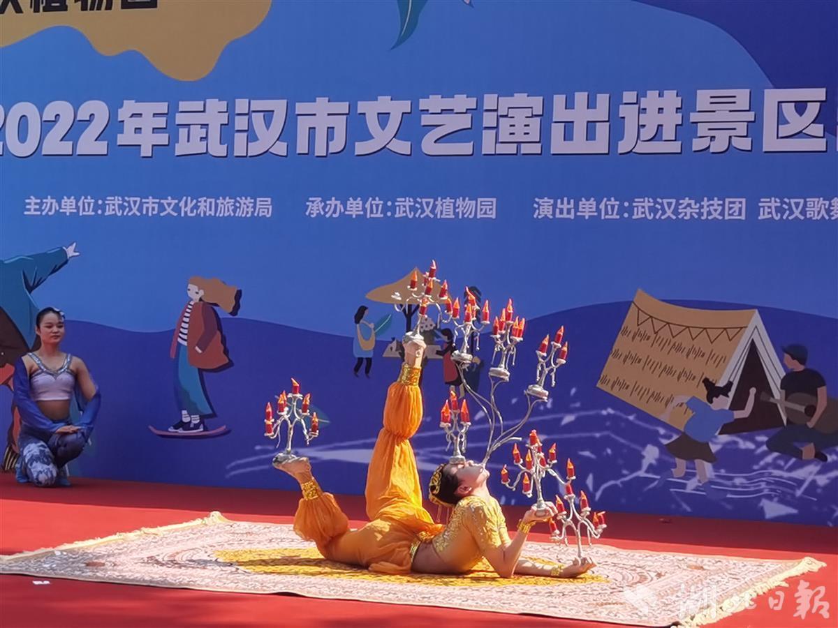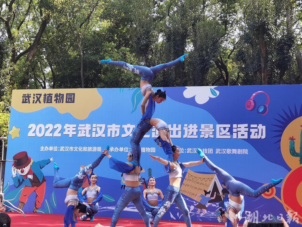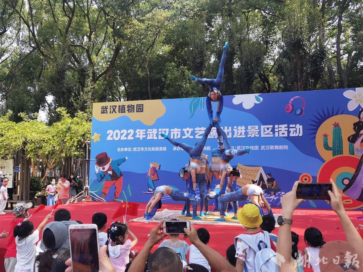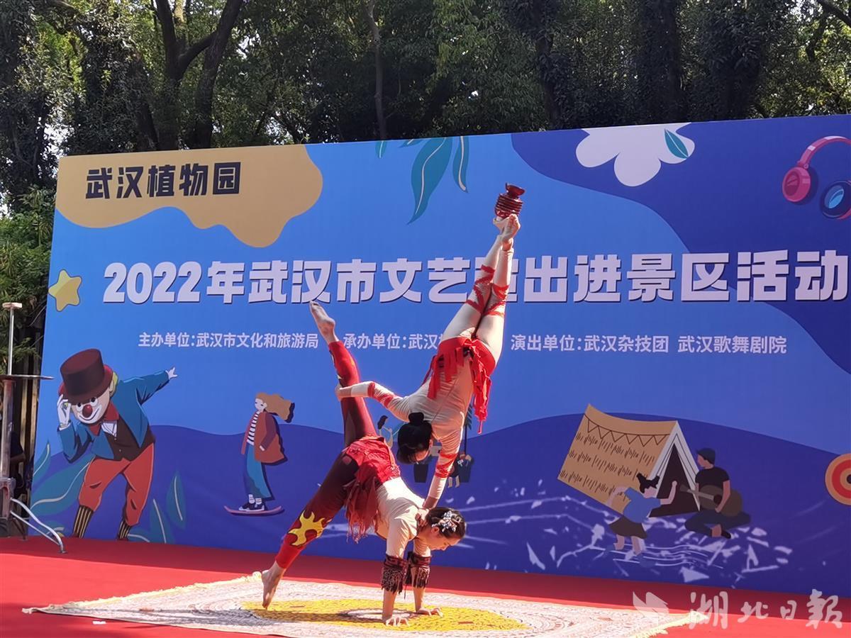 10月1日,中科院武汉植物园处处国旗招展,热闹非凡,在一处临时搭建的舞台上,来自武汉杂技团、武汉歌舞剧院的演员们各显神通,一天就表演了4场,杂技、歌舞、器乐等节目老少皆宜,异彩纷呈,许多旅客看得如痴如醉,掌声不断,不少游客还专门驱车前去看夜场。此次演出活动是2022年武汉市文艺演出进景区系列活动的一部分,由武汉市文旅局主办、武汉植物园承办。