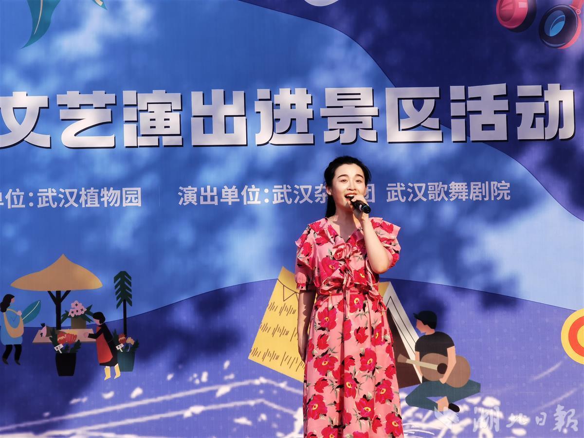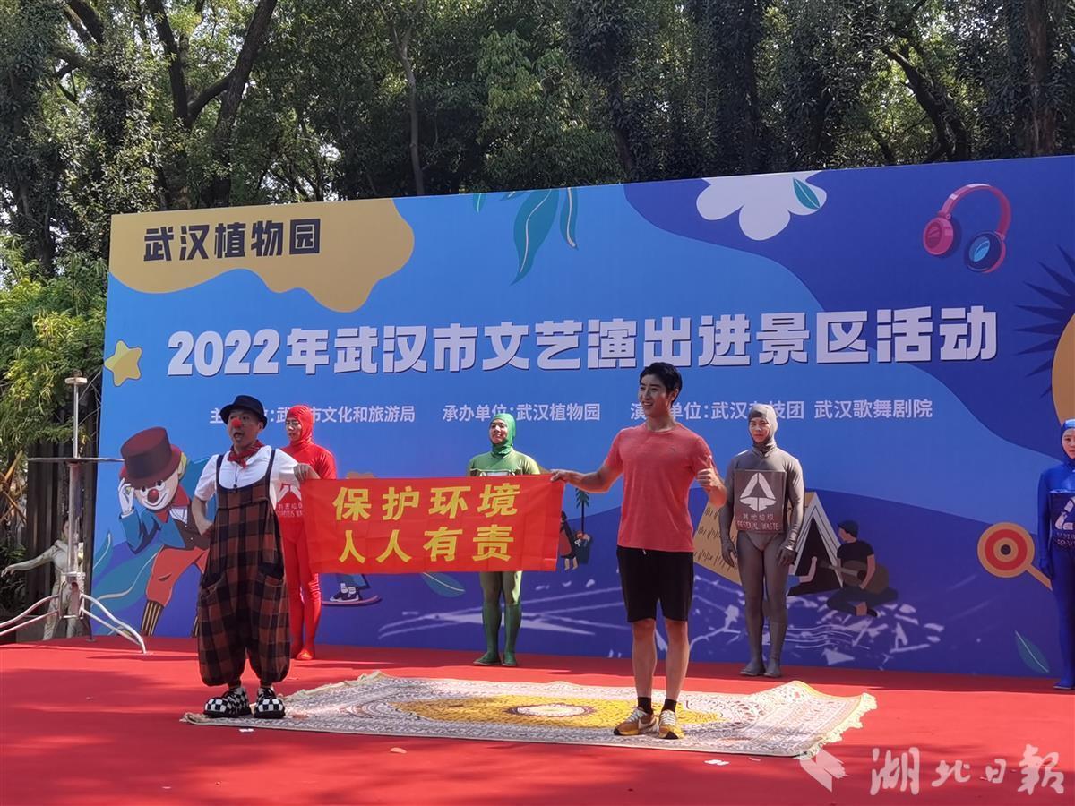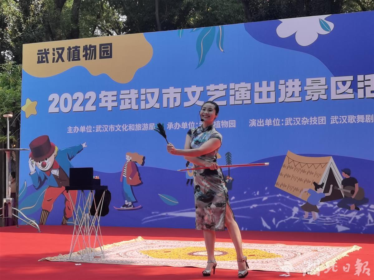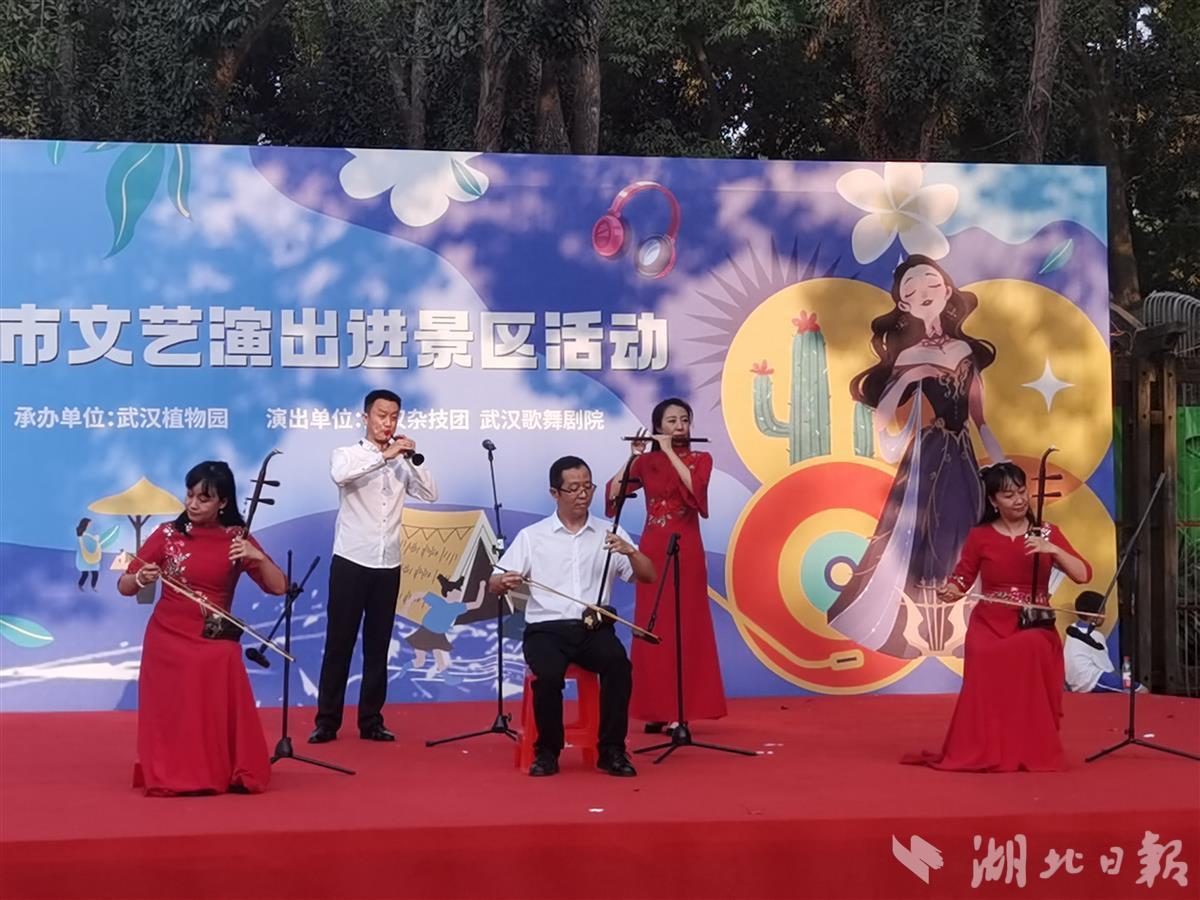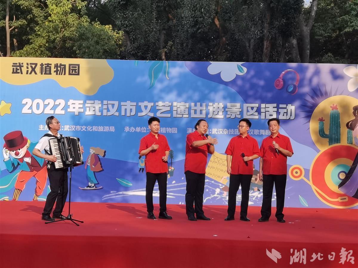 10月1日,中科院武汉植物园处处国旗招展,热闹非凡,在一处临时搭建的舞台上,来自武汉杂技团、武汉歌舞剧院的演员们各显神通,一天就表演了4场,杂技、歌舞、器乐等节目老少皆宜,异彩纷呈,许多旅客看得如痴如醉,掌声不断,不少游客还专门驱车前去看夜场。此次演出活动是2022年武汉市文艺演出进景区系列活动的一部分,由武汉市文旅局主办、武汉植物园承办。