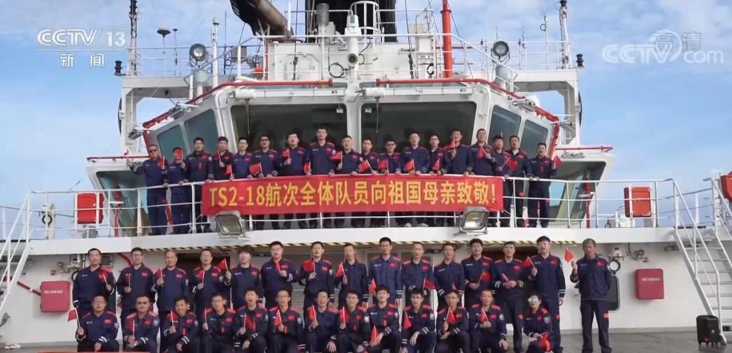 在碧波万顷的大海上,正在执行装备海事任务的科考队员聚集到甲板,在“探索二号”船上举行了庄严的升国旗仪式。在远离陆地的大海上,大家也以自己的方式为祖国送上祝福。