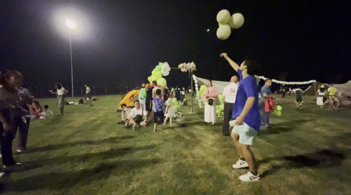 晚上8点左右,在排湖旅游度假区沔阳小镇天鹅洲,四百架无人机升起点亮夜空,拉开夜间帐篷音乐节的序幕,无人机在电脑控制下不断改换阵型,引来人群一声声惊叹。在游客的簇拥下,草坪中央点燃了一簇篝火,众人的笑脸映衬于闪烁的火光里,木材炸裂一声而后消失不见,跟着动感的音乐,大家围绕篝火舞动游戏。草地的其他空位上,三三两两地驻扎着一些帐篷,在架设的矮桌前,大家一同举杯,享受美景美酒美食,欢度国庆佳节。