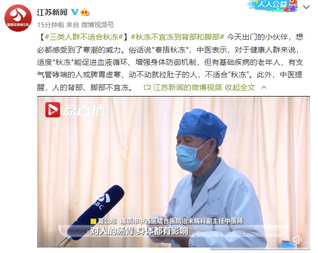 【三类人群不适合秋冻】今天出门的小伙伴,想必都感受到了寒潮的威力。俗话说"春捂秋冻",中医表示,对于健康人群来说,适度"秋冻"能促进血液循环、增强身体防御机制,但有基础疾病的老年人,有支气管哮喘的人或脾胃虚寒、动不动就拉肚子的人,不适合“秋冻”。此外,中医提醒,人的背部、脚部不宜冻。