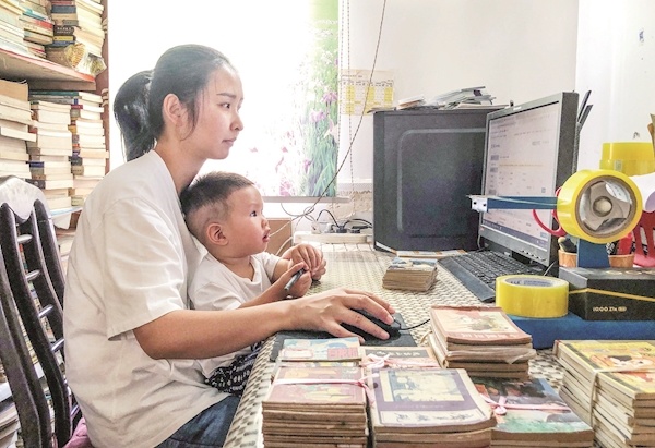 余茜一边照顾儿子,一边打理旧书交易生意