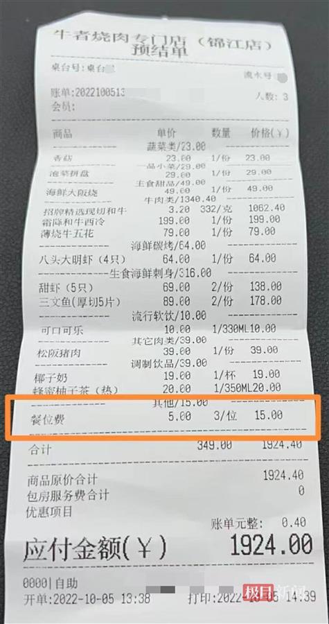 通过李女士向极目新闻记者出示的消费小票显示,其消费总金额为1924元,其中餐位费每位5元,3人共15元。