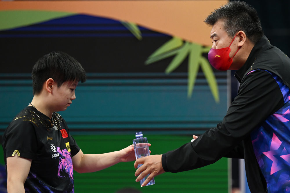 ↑10月4日,中国队选手孙颖莎(左)在比赛间隙与教练李隼交流。她以3比0战胜马来西亚队选手凯伦·莱恩。新华社记者 胥冰洁 摄 孙颖莎、王曼昱、王艺迪均轻松获胜。中国队以四战全胜小组第一的成绩顺利出线。