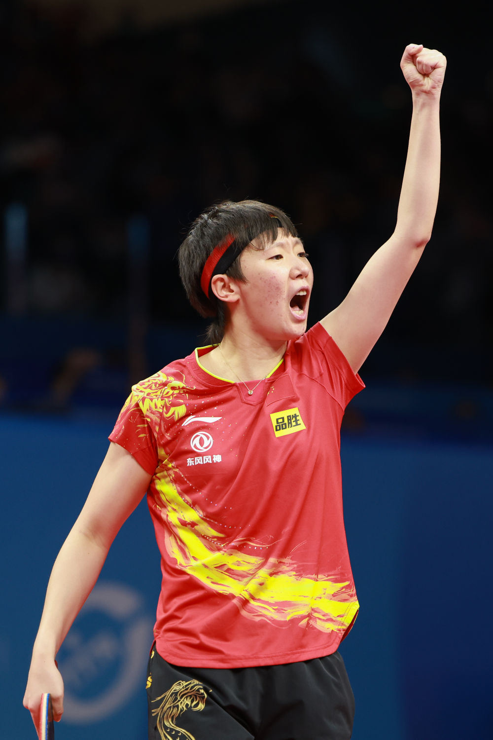 ↑10月8日,中国队选手王曼昱在比赛中庆祝,她以3比1战胜日本队选手伊藤美诚。