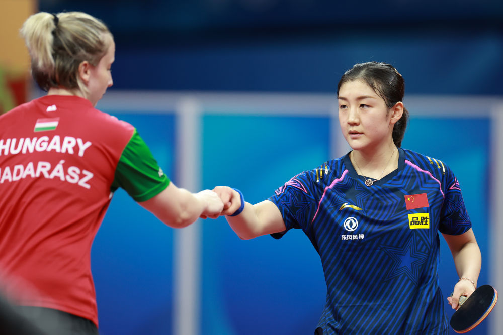 ↑10月5日,中国队选手陈梦(右)向对手致意,她以3比0战胜匈牙利队选手多拉·马达拉茨。新华社记者 刘续 摄