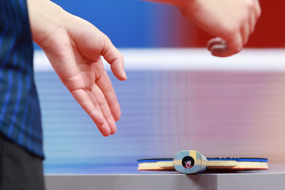 ↑10月3日,中国队选手孙颖莎在比赛中拿起印有自己头像的球拍。新华社记者 刘续 摄