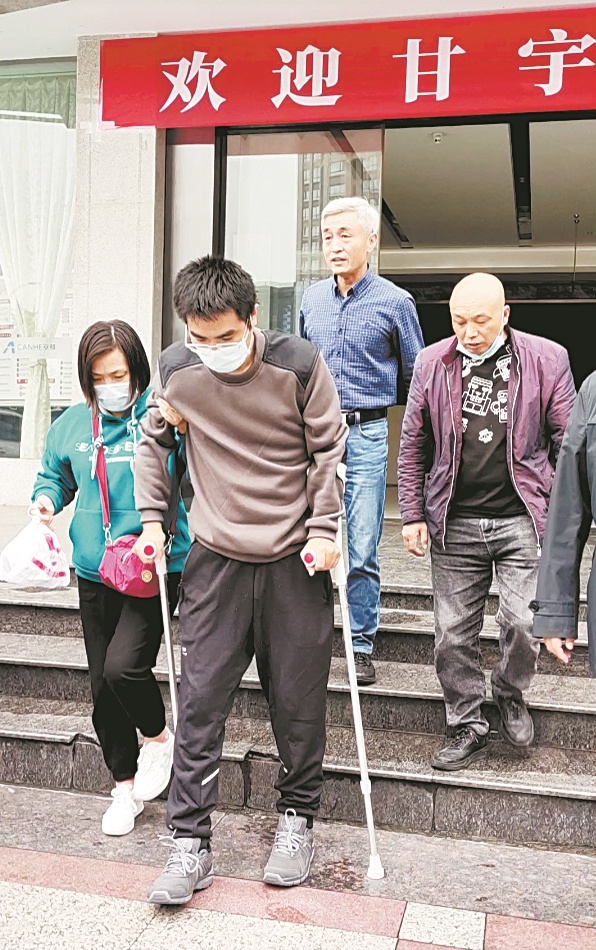 8日中午12时13分,甘宇在母亲陪伴下,拄着拐杖慢慢走出医院。早已在门口等候的家人和同事连忙迎上前去,将甘宇扶上准备好的轮椅。