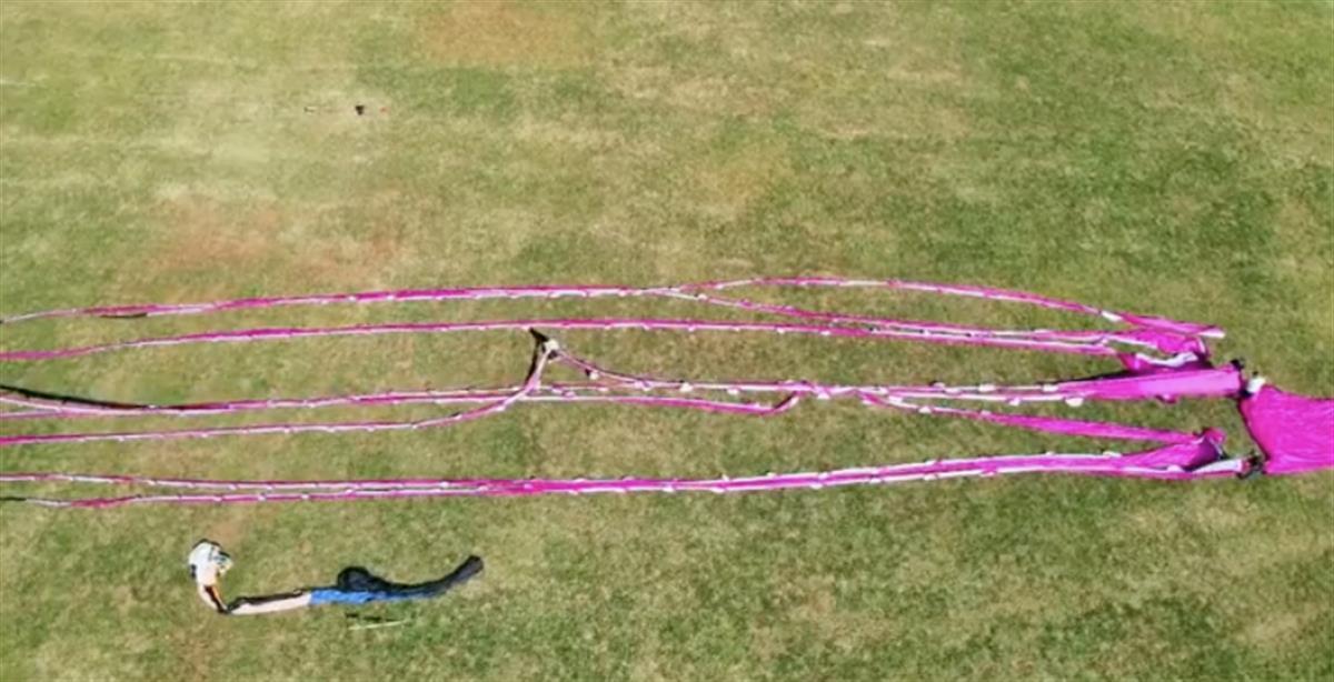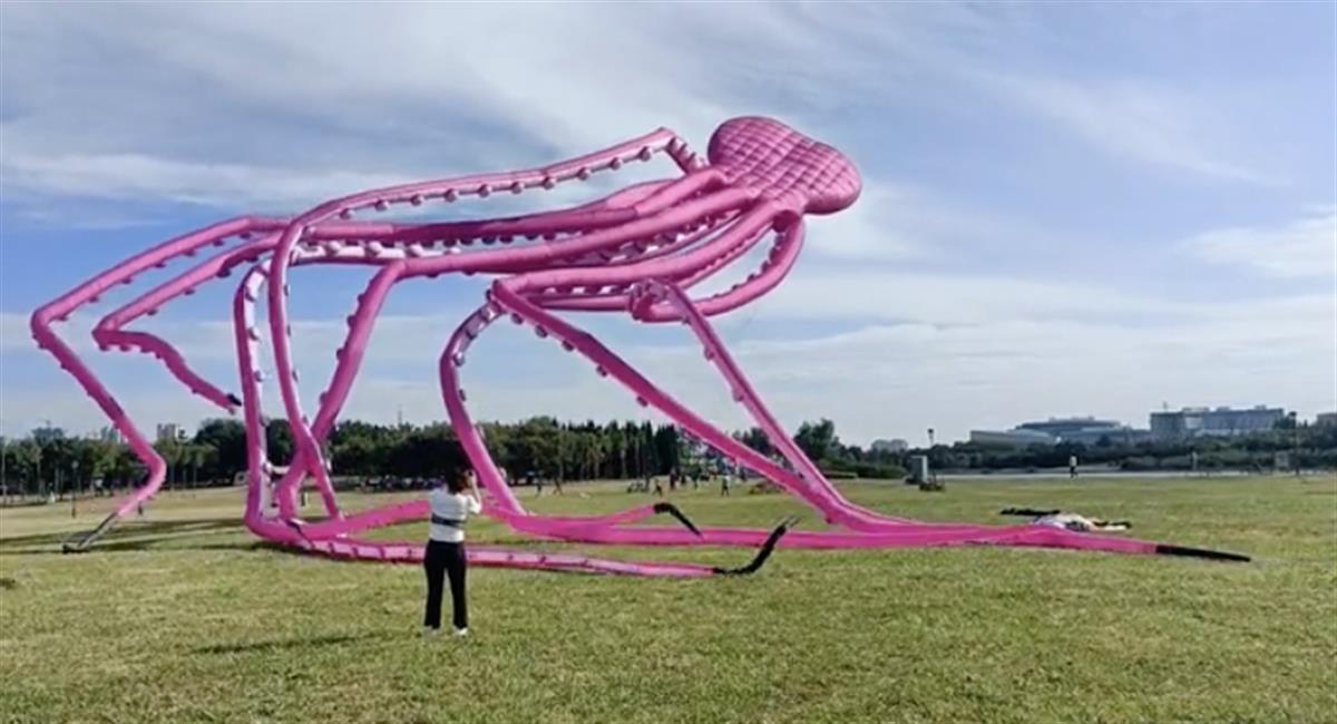 视频显示,公园内一处空旷的草地上,一只大型章鱼风筝铺在地上,几名风筝爱好者正携手将它们组装起来,随着几人一起用力,这只巨大的风筝腾空而起,颇为壮观。