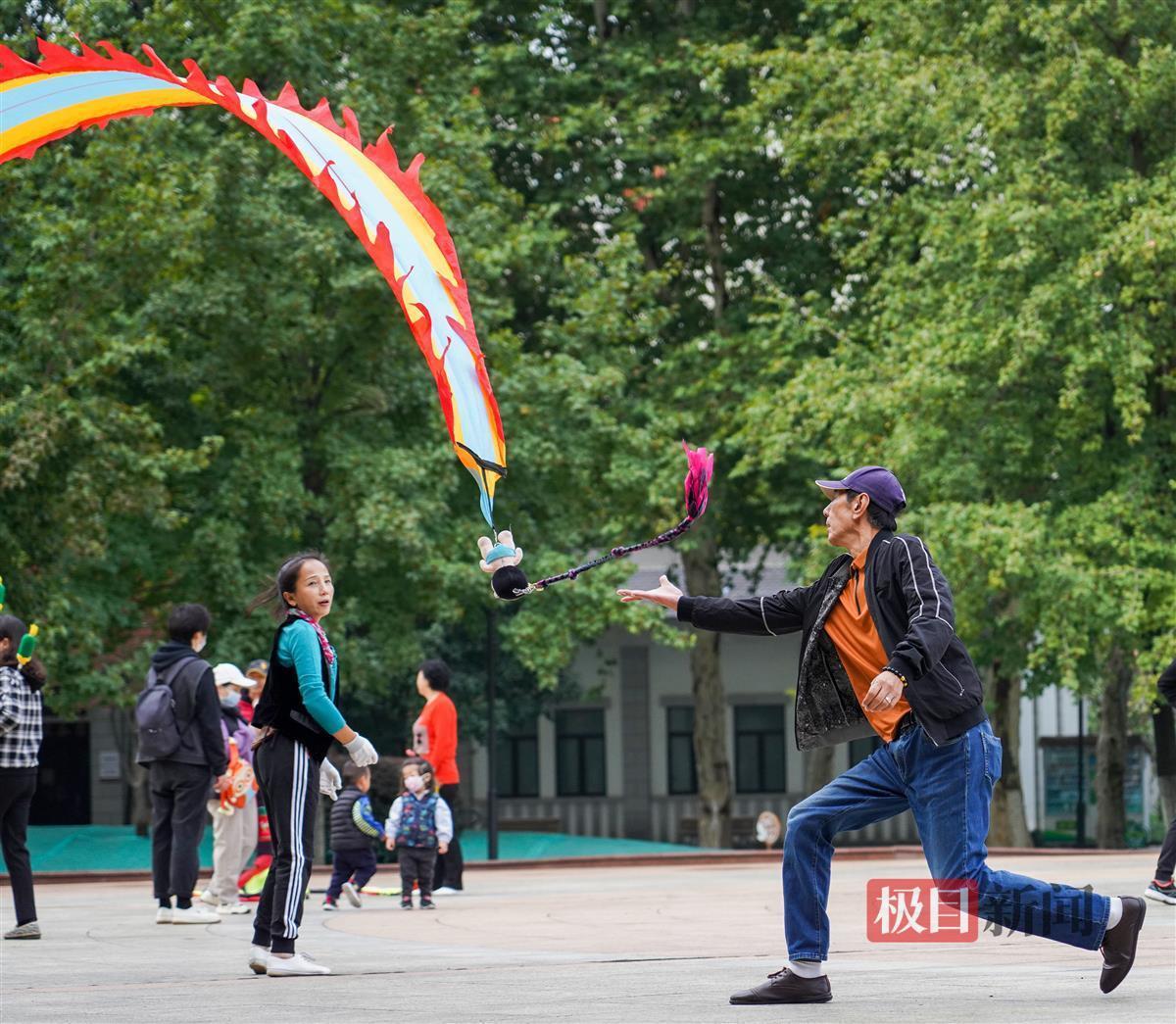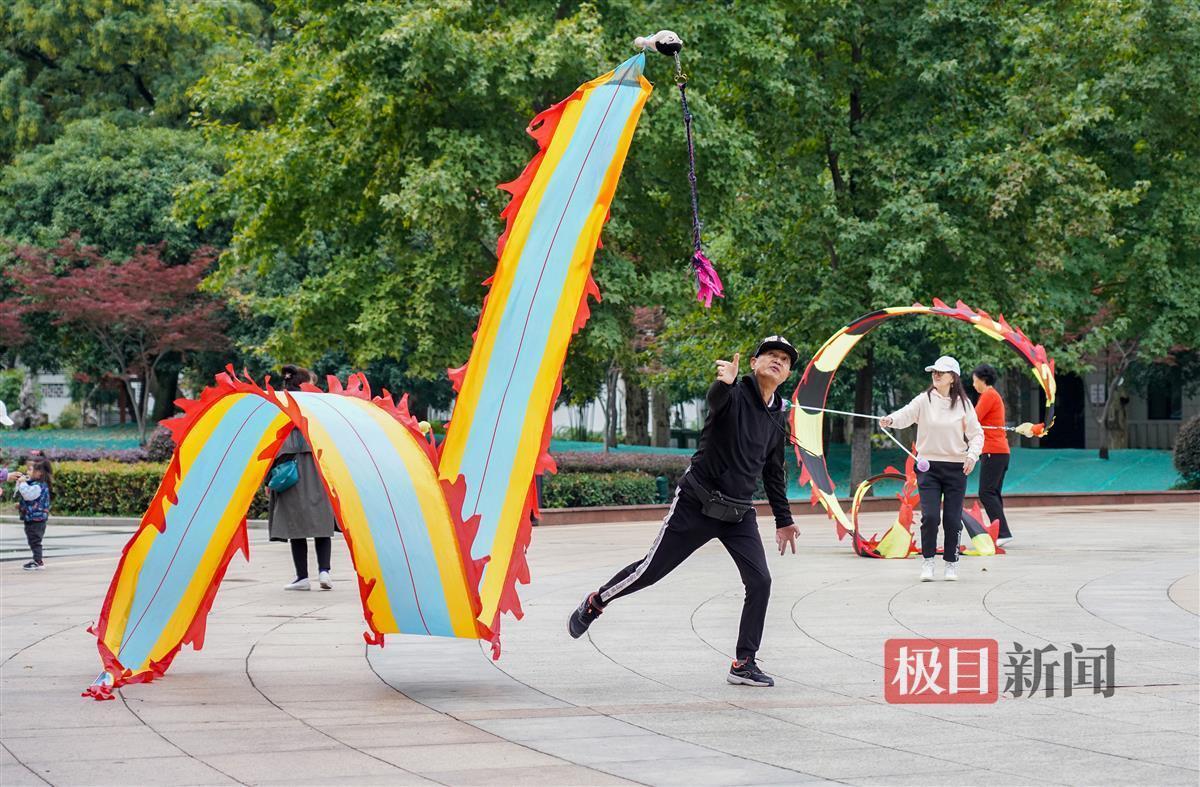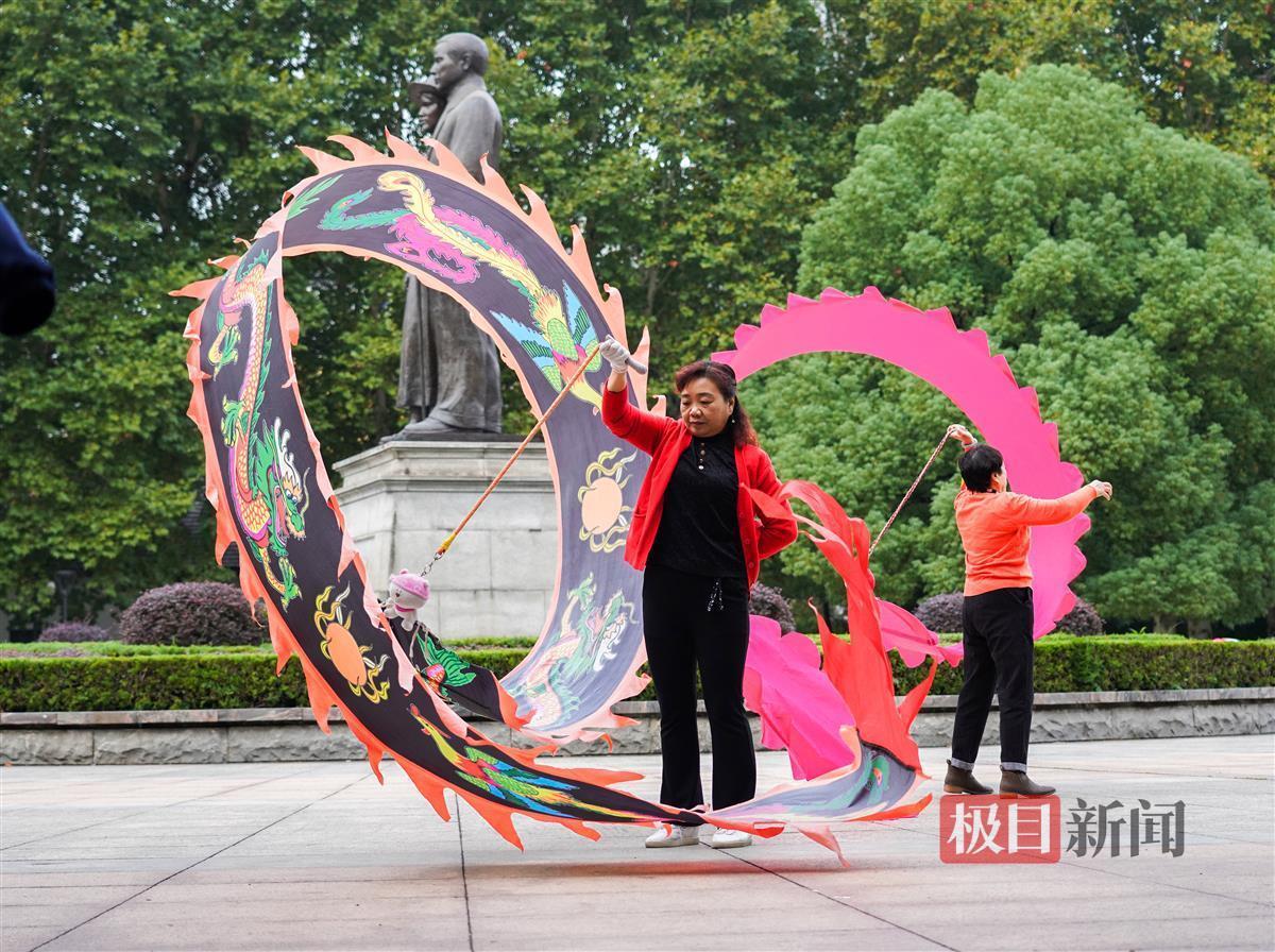 10月9日,武汉中山公园内,许多市民在此舞“彩带龙”健身,通过手臂摆动、脚步变动、腰部扭动将“彩带龙”舞得花样迭出。一条“彩带龙”在几人之间不断飞舞抛接传递,犹如飞龙在天,甚是好看。