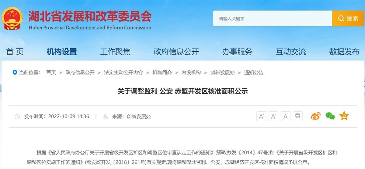 10月9日,湖北省发改委发布公示公告,拟调整湖北监利、公安、赤壁经济开发区核准面积。其中,监利经济开发区核准面积拟由248.75公顷调整为1429.55公顷,公安经济开发区核准面积拟由22.39公顷调整为1253.20公顷,赤壁经济开发区核准面积拟由384.55公顷调整为1118.56公顷。