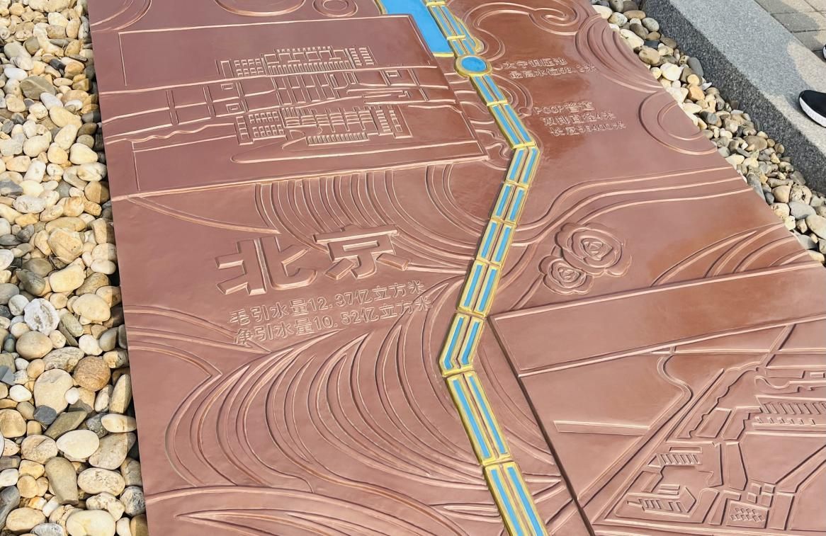 团城湖纪念广场上,一座名为“地上天河”的铜制雕塑,雕刻了南水北调中线重要的工程名称和主要供水城市。在“地上天河”的两边,镌刻着中线工程建设者们的名字和手印。
