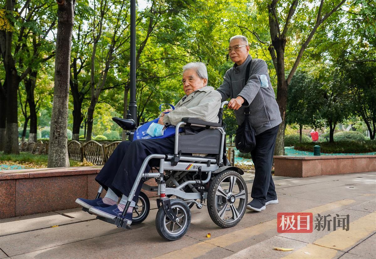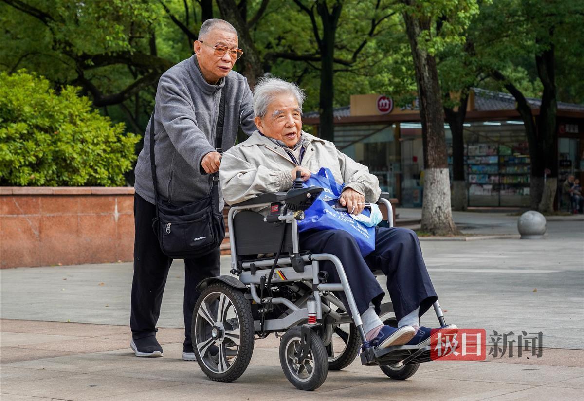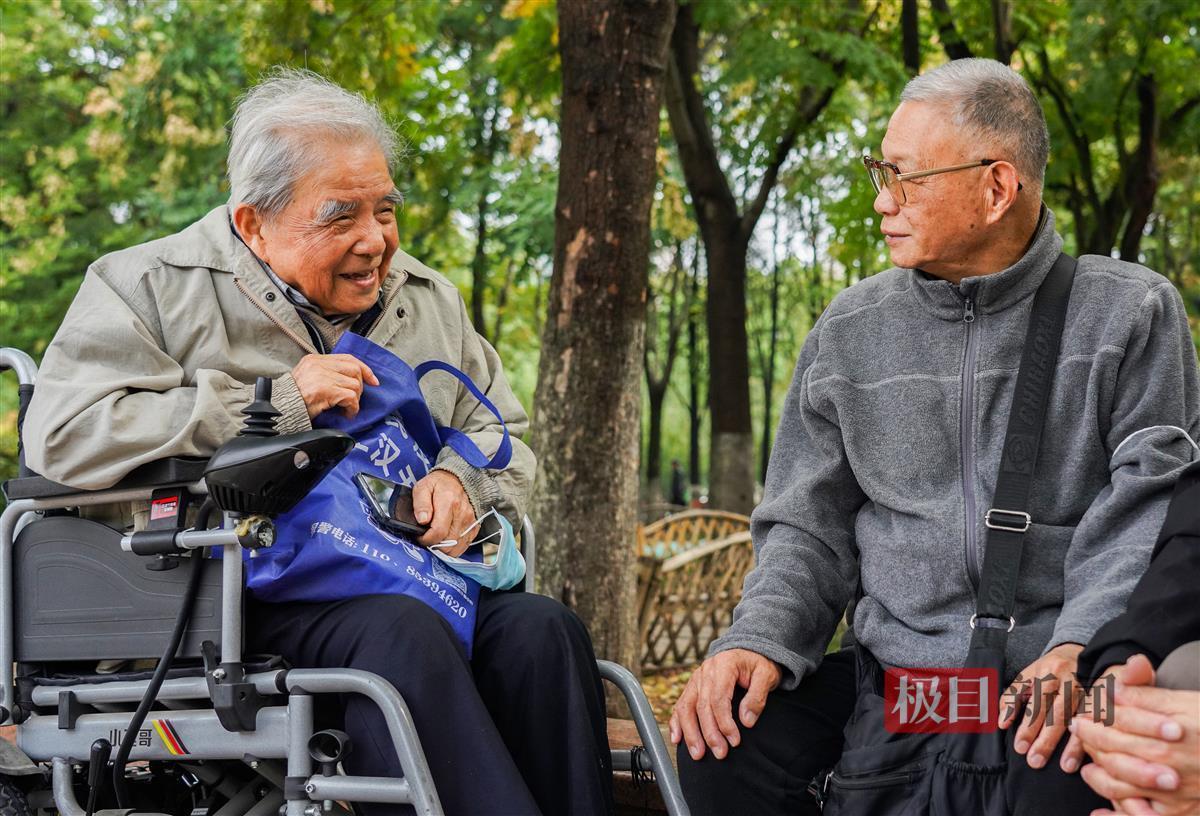 一大早的中山公园内,已经满是前来晨练的市民。在公园处一角,85岁的魏成林推着坐在轮椅上91岁的邓作民,一边说笑,一边慢慢走着。两位老人看见极目新闻记者的到来,热情地打着招呼,“今天天气终于放晴了,我们就决定按照约定,一起来散步!”