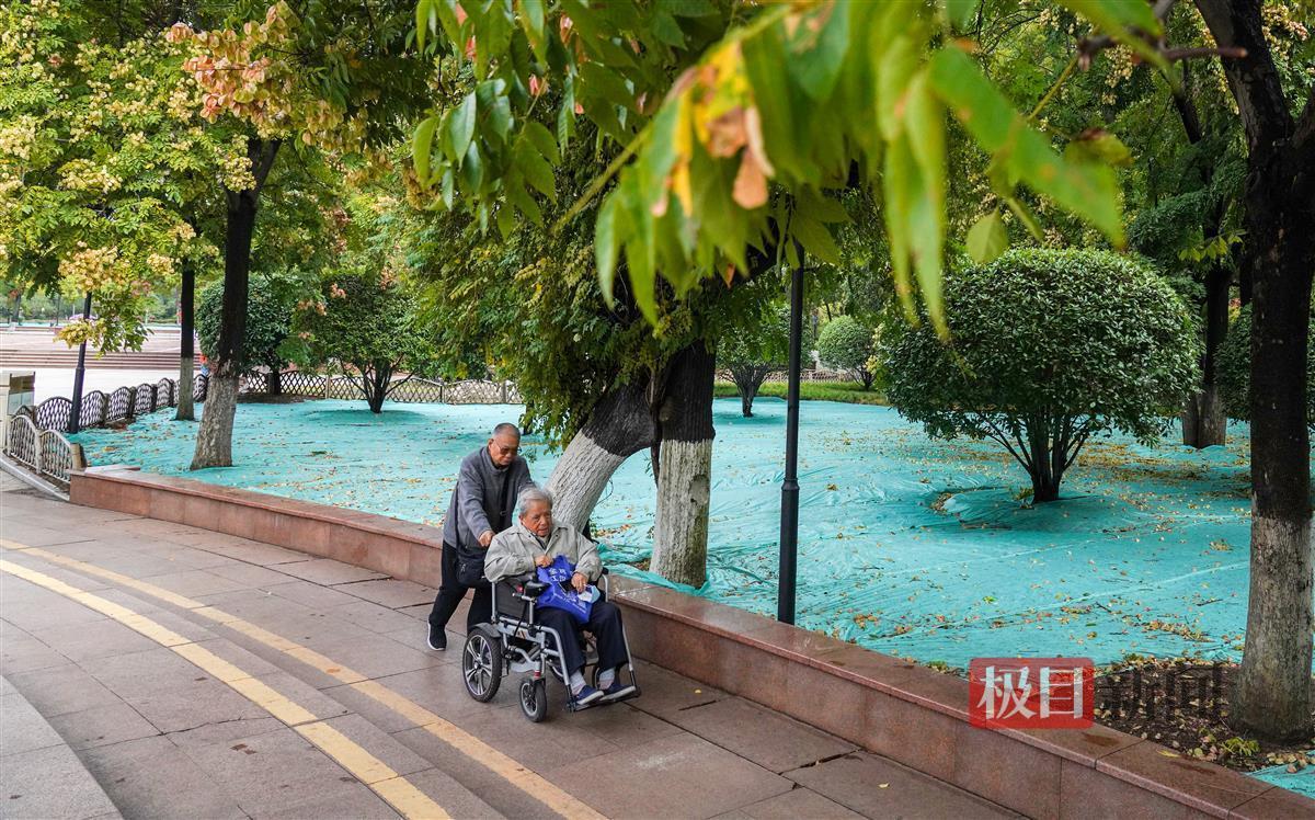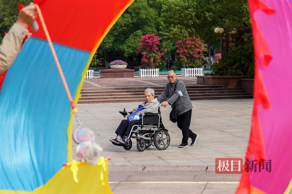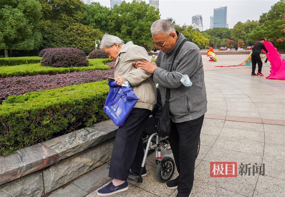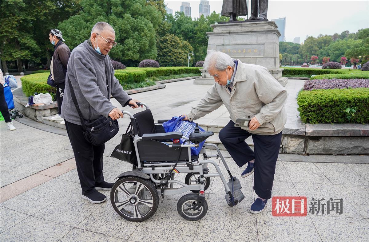 一大早的中山公园内,已经满是前来晨练的市民。在公园处一角,85岁的魏成林推着坐在轮椅上91岁的邓作民,一边说笑,一边慢慢走着。两位老人看见极目新闻记者的到来,热情地打着招呼,“今天天气终于放晴了,我们就决定按照约定,一起来散步!”