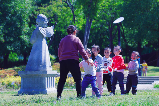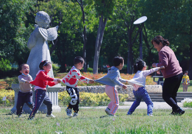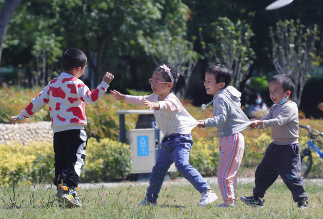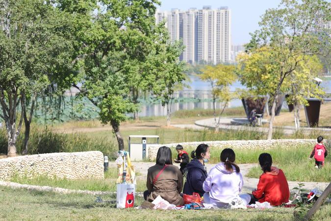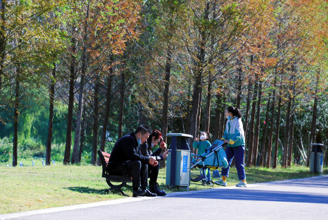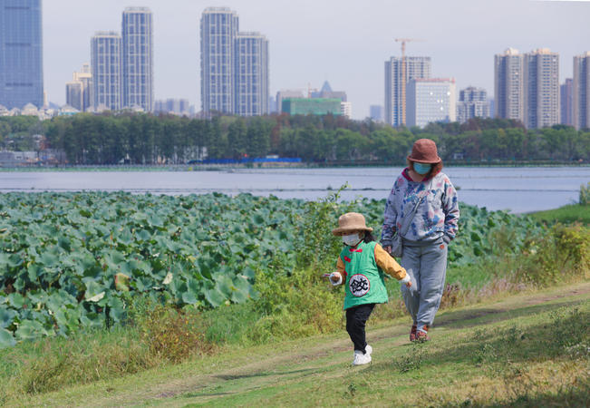 2022年10月10日天气晴好,气温回升。在武汉市汉阳区墨水湖南岸的国际风情园里,不少市民在园内散步,带孩子玩耍,还有一群相遇在游玩路上的小朋友们,组团玩起了快乐的游戏,秋日暖阳的快乐如此简单。