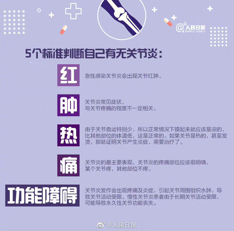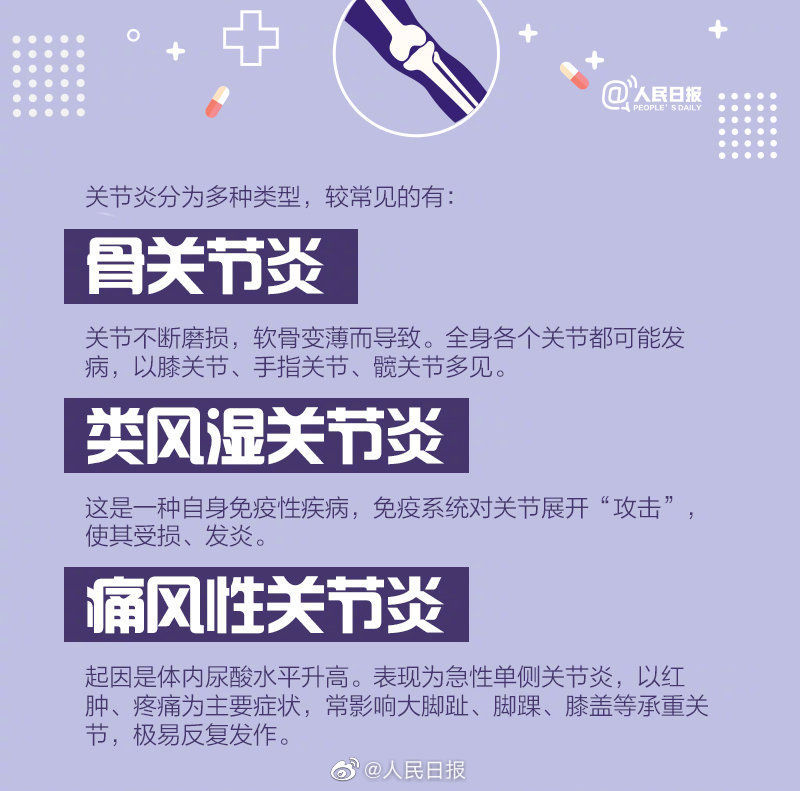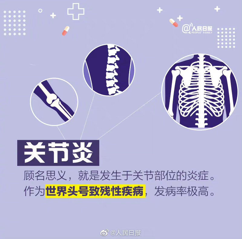 目前,我国关节炎发病呈年轻化趋势。什么人群容易患关节炎?如何判断自己有无关节炎?如何保护关节?今天是世界关节炎日。保护关节,转给你关心的人。