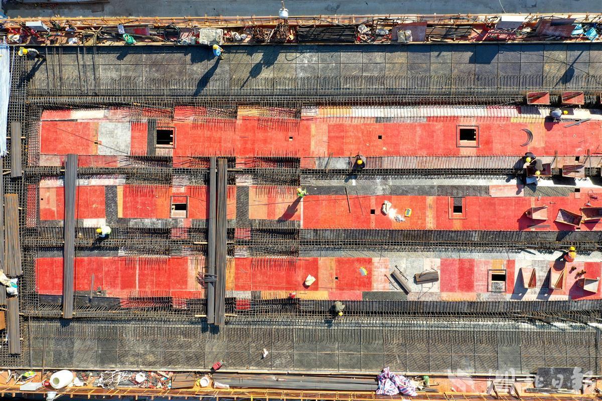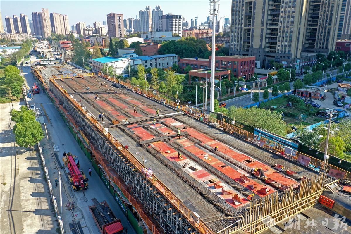 2022年10月11日,在武汉市硚口区古田三路南泥湾大道改造工程施工现场,工人们正在桥梁上进行施工。
