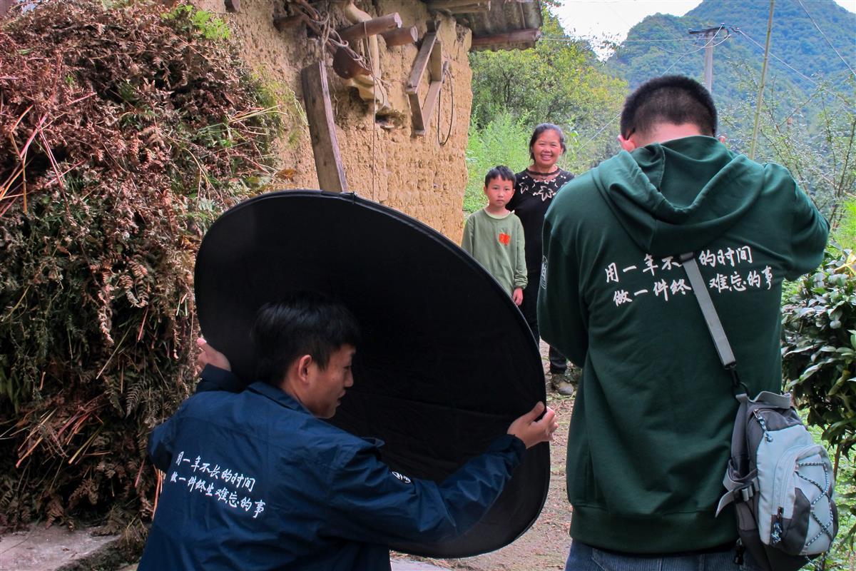 一条长板凳、一个打光板,志愿者们利用简单的道具,在蓝天白云和绿水青山的衬托下,用镜头记录下40名学生家庭的珍贵影像。