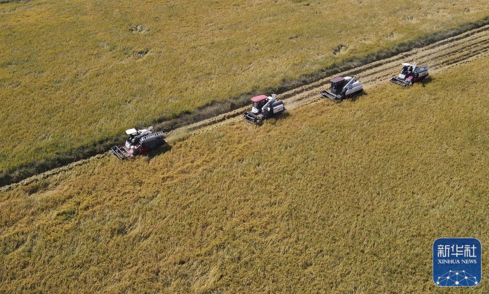 10月11日,在安徽省芜湖市繁昌区新港镇,村民驾驶收割机收割水稻(无人机照片)。新华社记者 周牧 摄