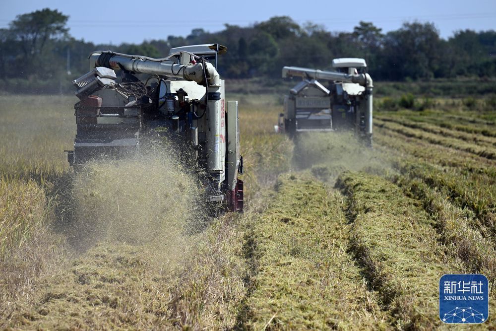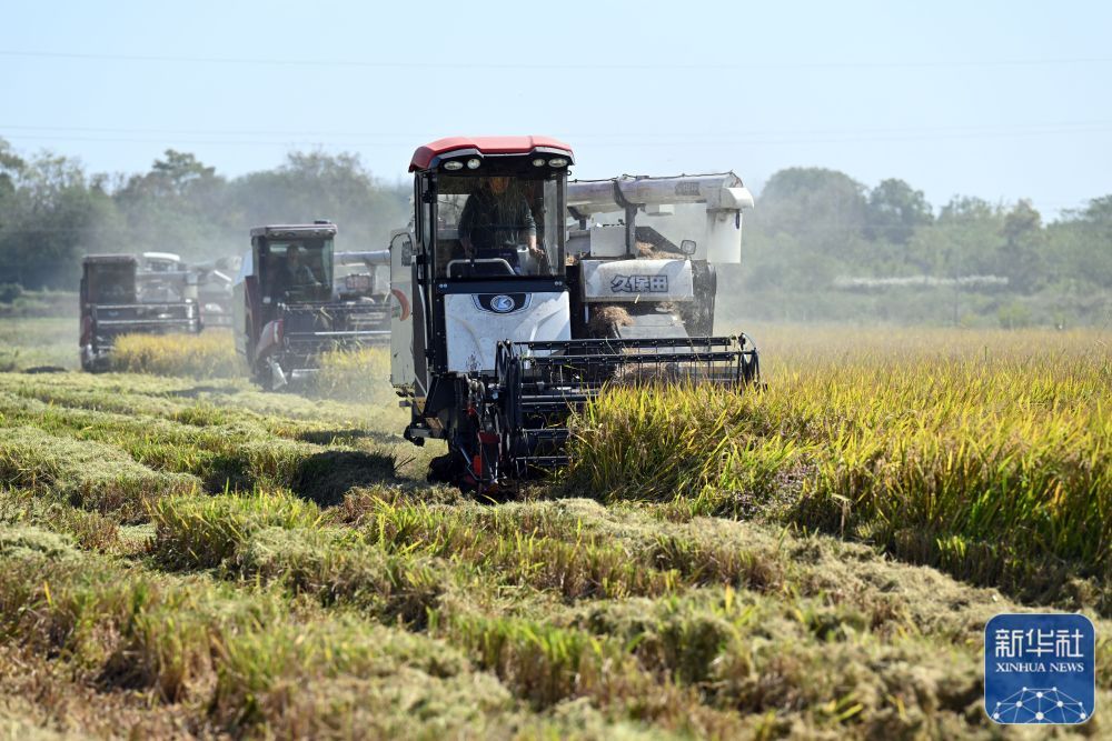 10月11日,在安徽省芜湖市繁昌区新港镇,村民驾驶收割机收割水稻。新华社记者 周牧 摄