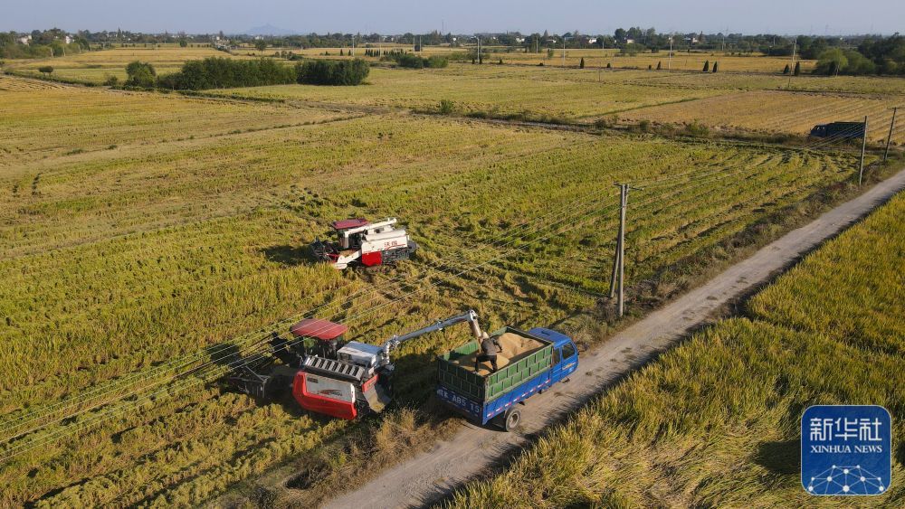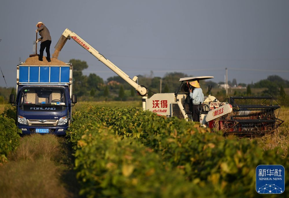 10月11日,在安徽省芜湖市繁昌区平铺镇,村民将收割的水稻装车。新华社记者 周牧 摄