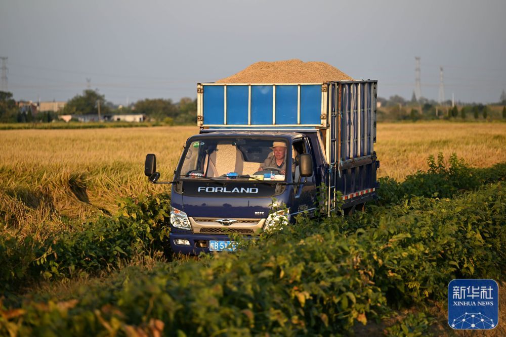 10月11日,在安徽省芜湖市繁昌区平铺镇,村民开车运送收割的水稻。新华社记者 周牧 摄