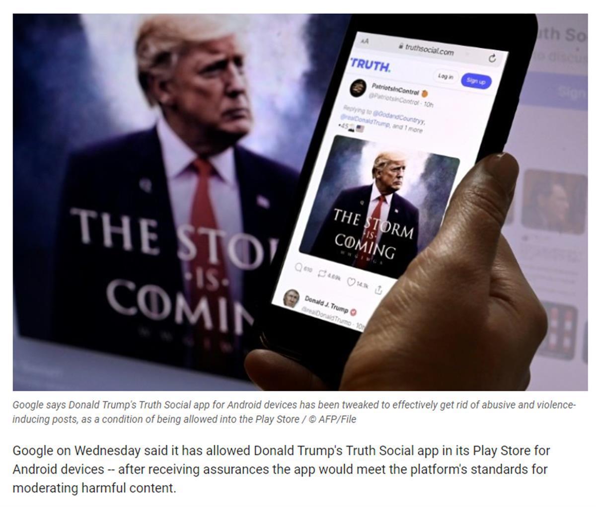 报道称,今年8月,谷歌表示已通知“真相社交”,其应用程序违反了应用商店的相关政策,该平台需要一个“有效的系统来审核用户生成的内容”。现在,按照谷歌的说法,“真相社交”已经更新了相关政策,也因此获得批准。