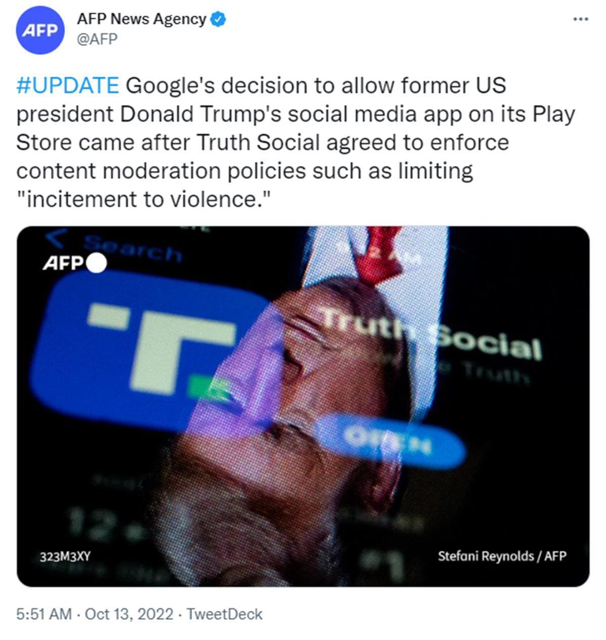 “应用软件在应用商店上架的前提是,它们遵守我们的‘开发者指南’,包括有效审核用户生成的内容,并删除煽动暴力等令人反感的帖子。”谷歌的一位发言人在回应法新社的提问时说道。