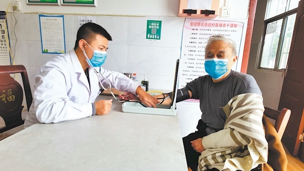 罗熠成医生为谢先祥老人测血压。 (湖北日报全媒记者 汪洋 摄)