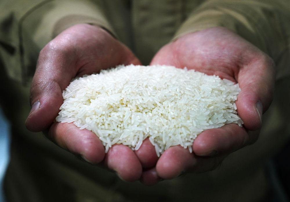 ↑在位于江西省南昌县的一个粮食加工工厂,工人展示加工后的大米(10月11日摄)。