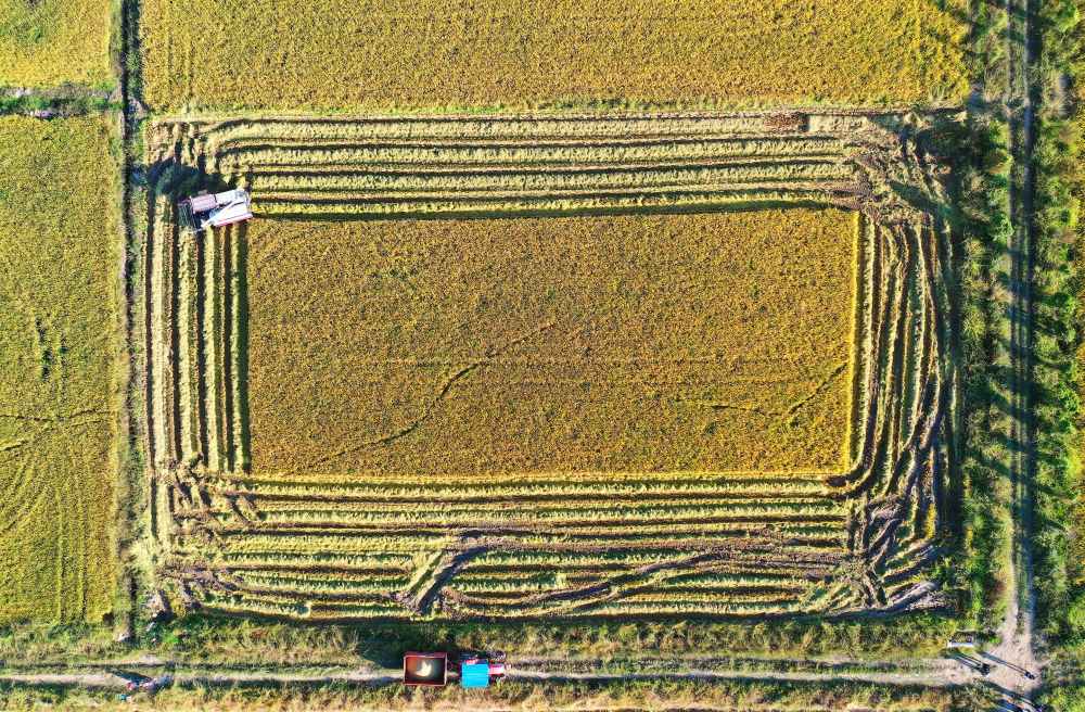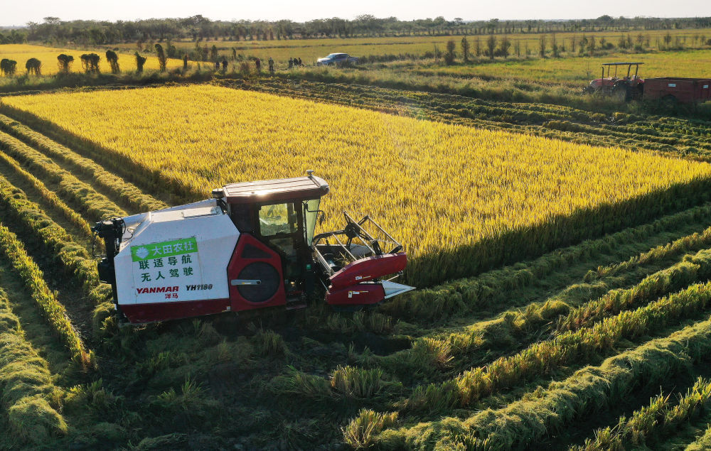 ↑在江西省南昌县大田农社,无人驾驶收割机在收割水稻(10月11日摄)。