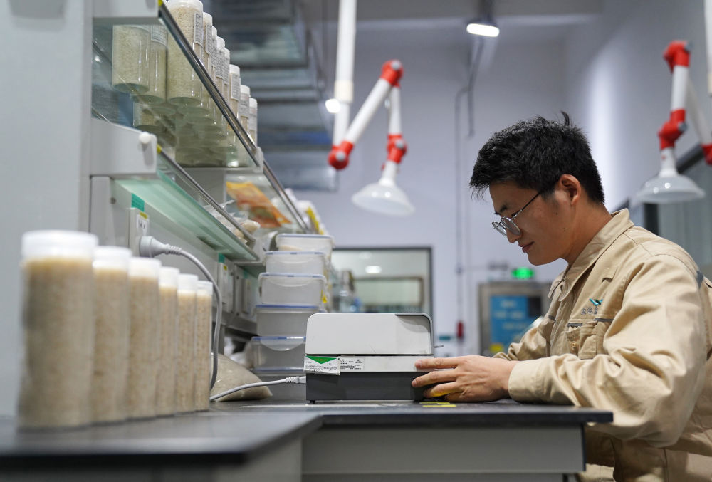 ↑在位于江西省南昌县的一个粮食加工工厂,技术人员对加工后的大米进行检测(10月11日摄)。