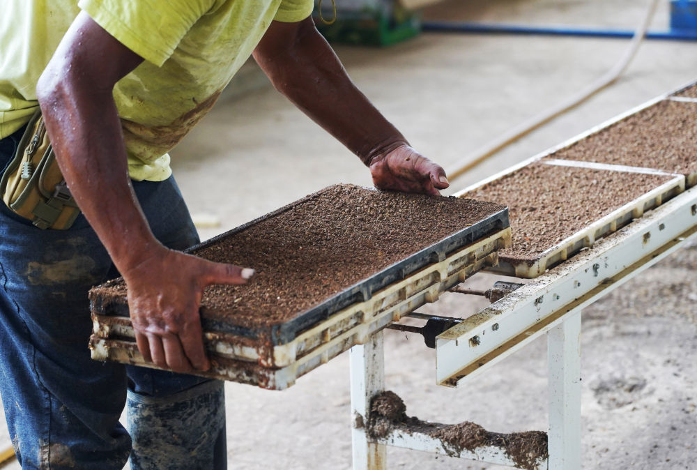 ↑这是在江西省南昌县大田农社育秧车间拍摄的流水线上的秧盘(7月20日摄)。