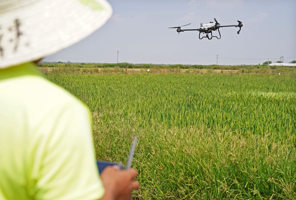 ↑在江西省南昌县大田农社,农民操控无人机为稻田施肥(9月16日摄)。