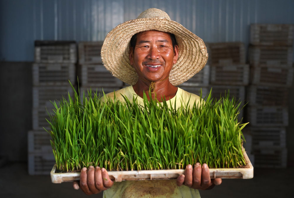 ↑在江西省南昌县大田农社,农民手捧秧盘展示秧苗(7月20日摄)。